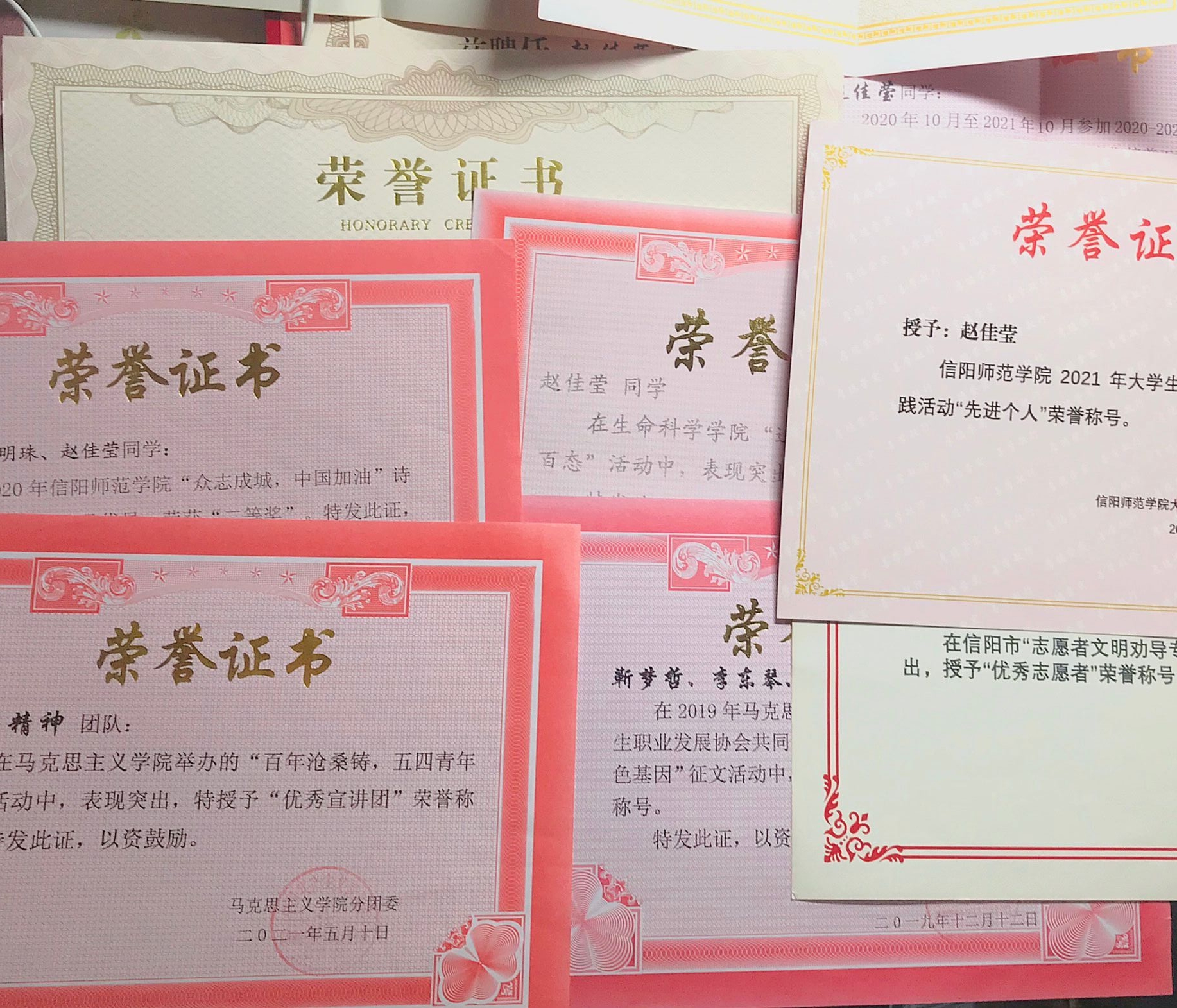 在学院学生会工作中,认真做好部门负责人一职,协助就业指导老师为学院毕业生服务。一年以来,一直秉承“踏实严谨、不断进取”的理念,提升自身工作能力,完成学院的各项就业工作,举办多场就业双选会,为beat365毕业生服务,曾荣获信阳师范学院学生会述职评议工作“优秀个人”称号。在班级中,认真做好寝室长一职,热心帮助、团结同学,协助班委开展日常工作,推动班级工作顺利开展。