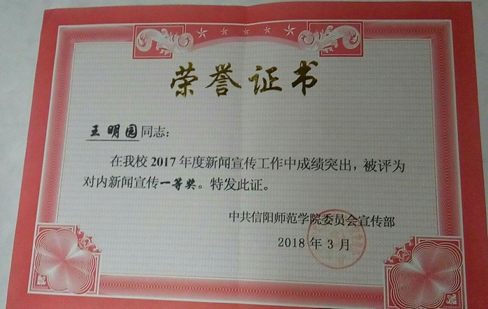 在学术研究中,申请并参与的2016年度大学生科研基金一般项目《法律视角下共享单车的侵权类型以及防范—以信阳师范学院为例》获得立项,所写《大学生暑假工作情况调查研究》获得beat365在线唯一官网2017年暑期社会实践 调研报告三等奖。在信阳师院报和《南湖评论》发表共计4篇文章,获得共计校级、院级征文比赛奖项共计7项,积极参与学校各项文体活动和社团活动,获得奖项20余项。