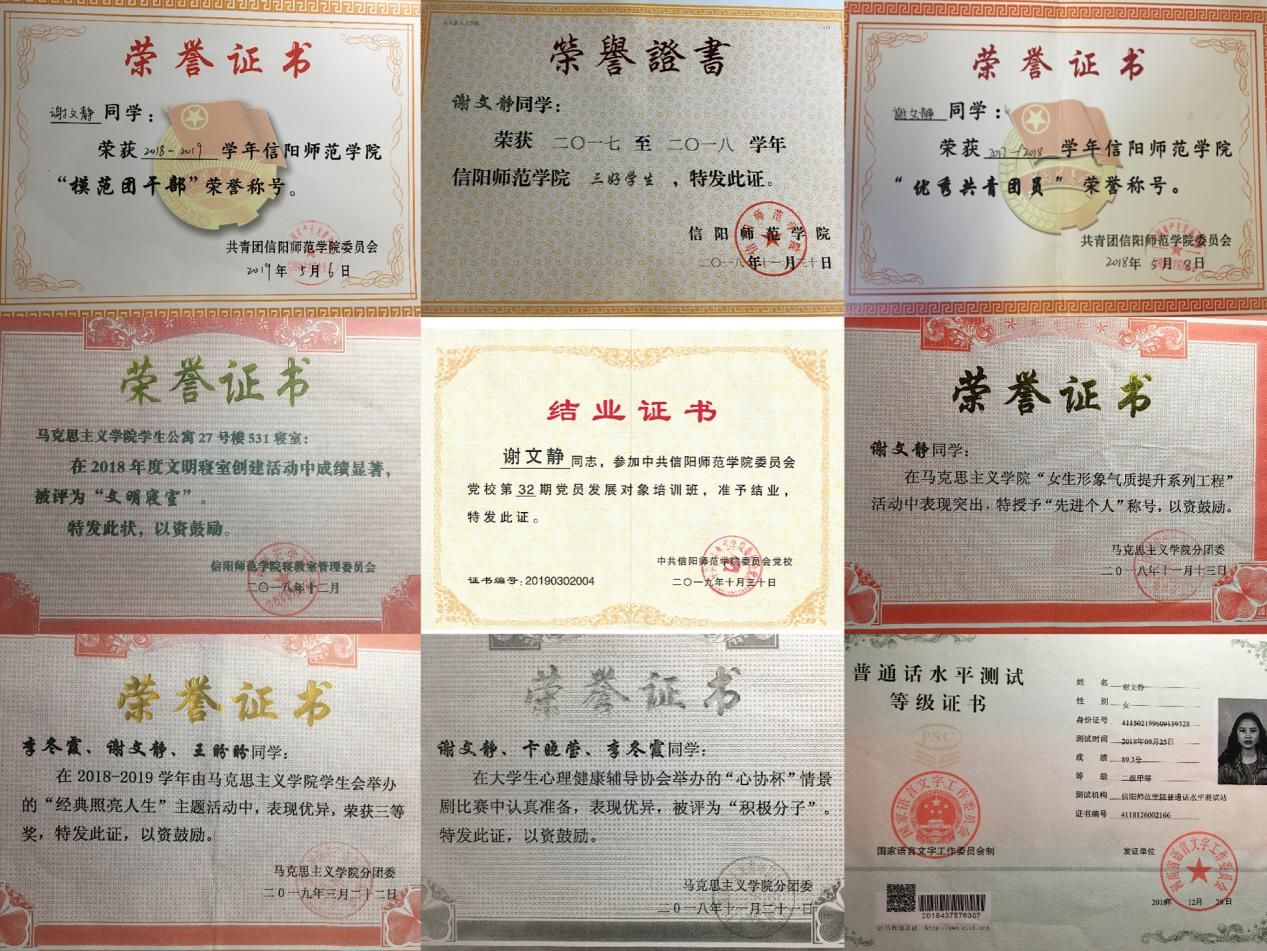 谢文静,女,河南信阳人,1998年9月出生,中共预备党员,信阳师范学院beat365在线唯一官网本科2017级思想政治教育一班的学生。现任2017级思想政治教育一班团支书和心理委员。该生乐于奉献,团结同学,思想端正,具有坚定的理想信念,政治立场坚定。