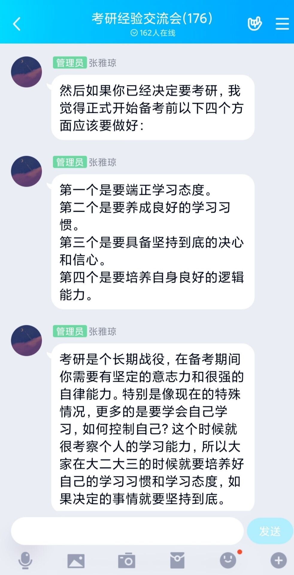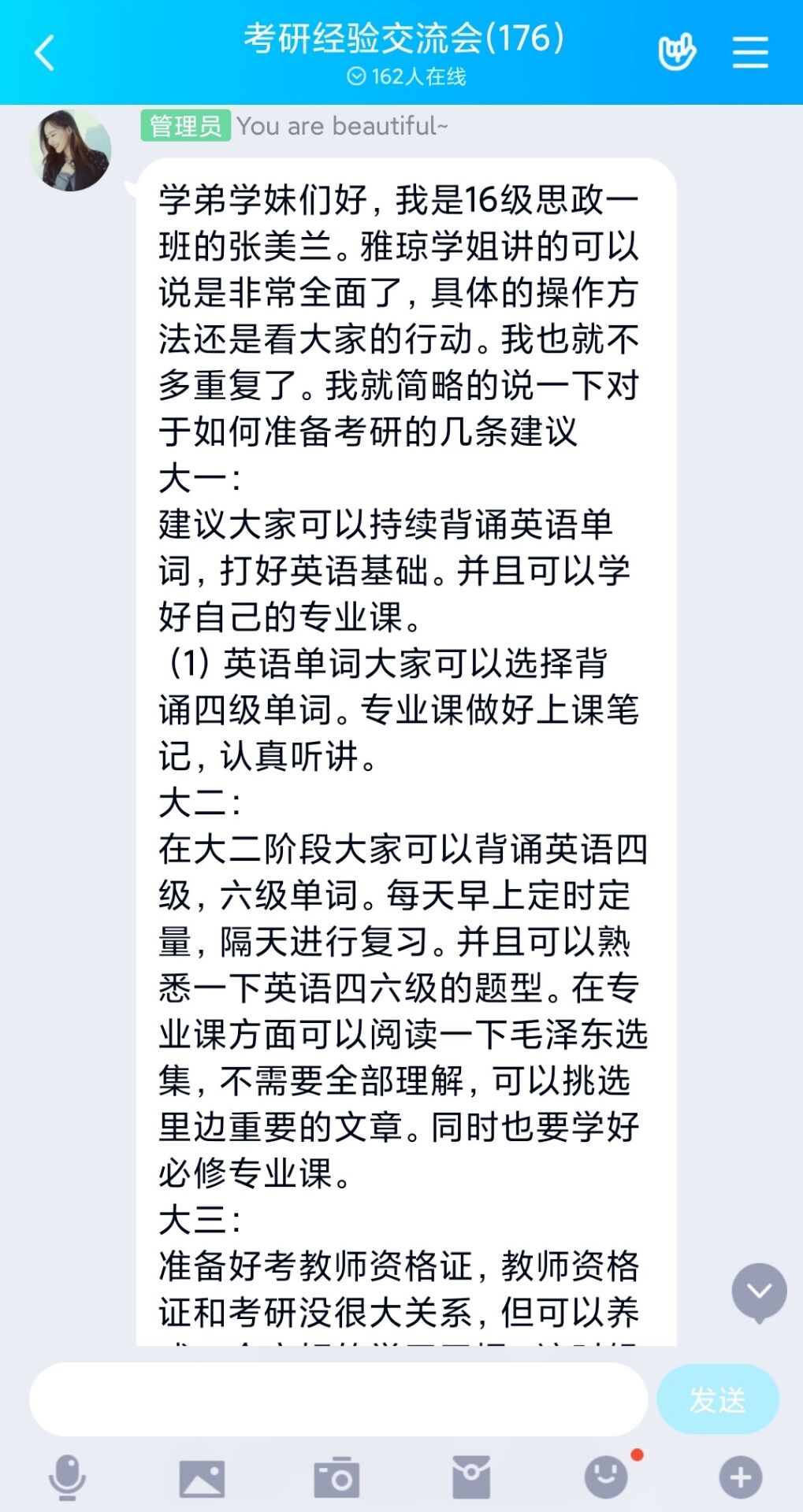 6月11日下午,beat365在线唯一官网考研服务社通过腾讯QQ线上平台举办了“以梦为笔,绘美研途”主题考研经验交流会。beat3652016级优秀考研学生代表张雅琼、张美兰以及2018、2019级有意向考研的同学共同参加本次交流会。会议由考研服务社牛笑怡主持。