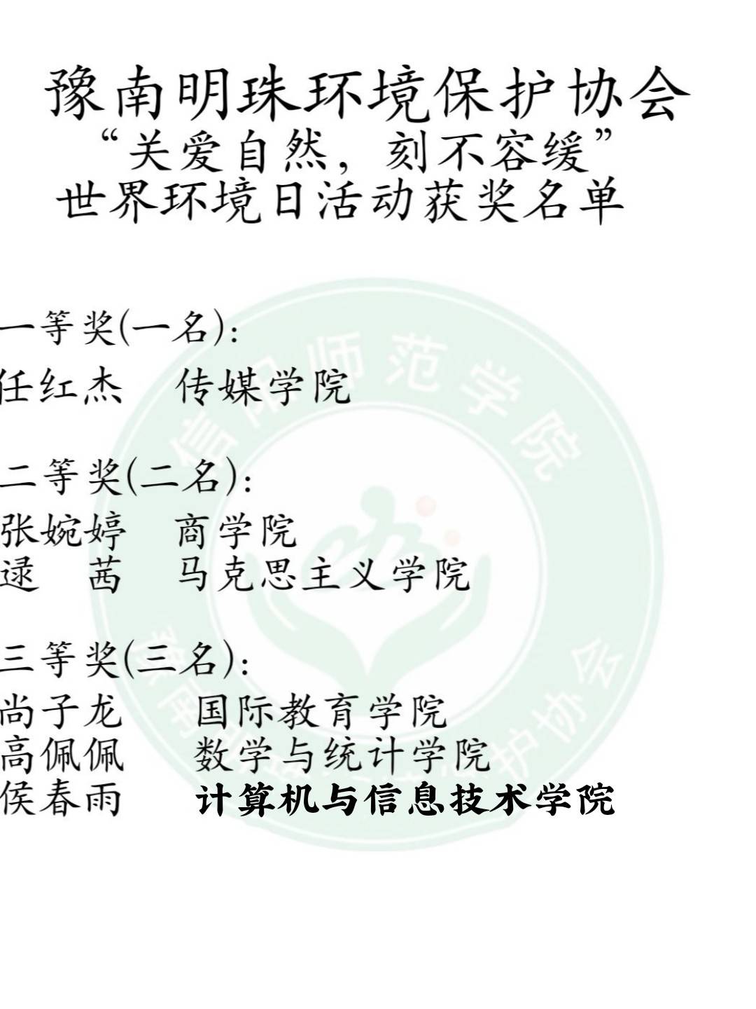 为增强学生的环保意识,培养学生的环保素养,6月8日—6月15日,由beat365在线唯一官网分团委主办,豫南明珠环境保护协会承办的以“关爱自然,刻不容缓”为主题的世界环境日活动于到梦空间线上平台顺利开展。
