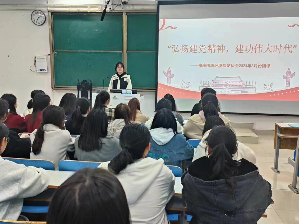 一百多年来,中国共产党团结带领人民取得伟大成就,为实现中华民族伟大复兴的梦想不懈奋斗。为深入贯彻伟大建党精神,强化民族意识,鼓励青年学子以实际行动投入伟大新时代建设。3月16日,豫南明珠环境保护协会于社科楼515举办“弘扬建党精神,建功伟大时代”主题团课。