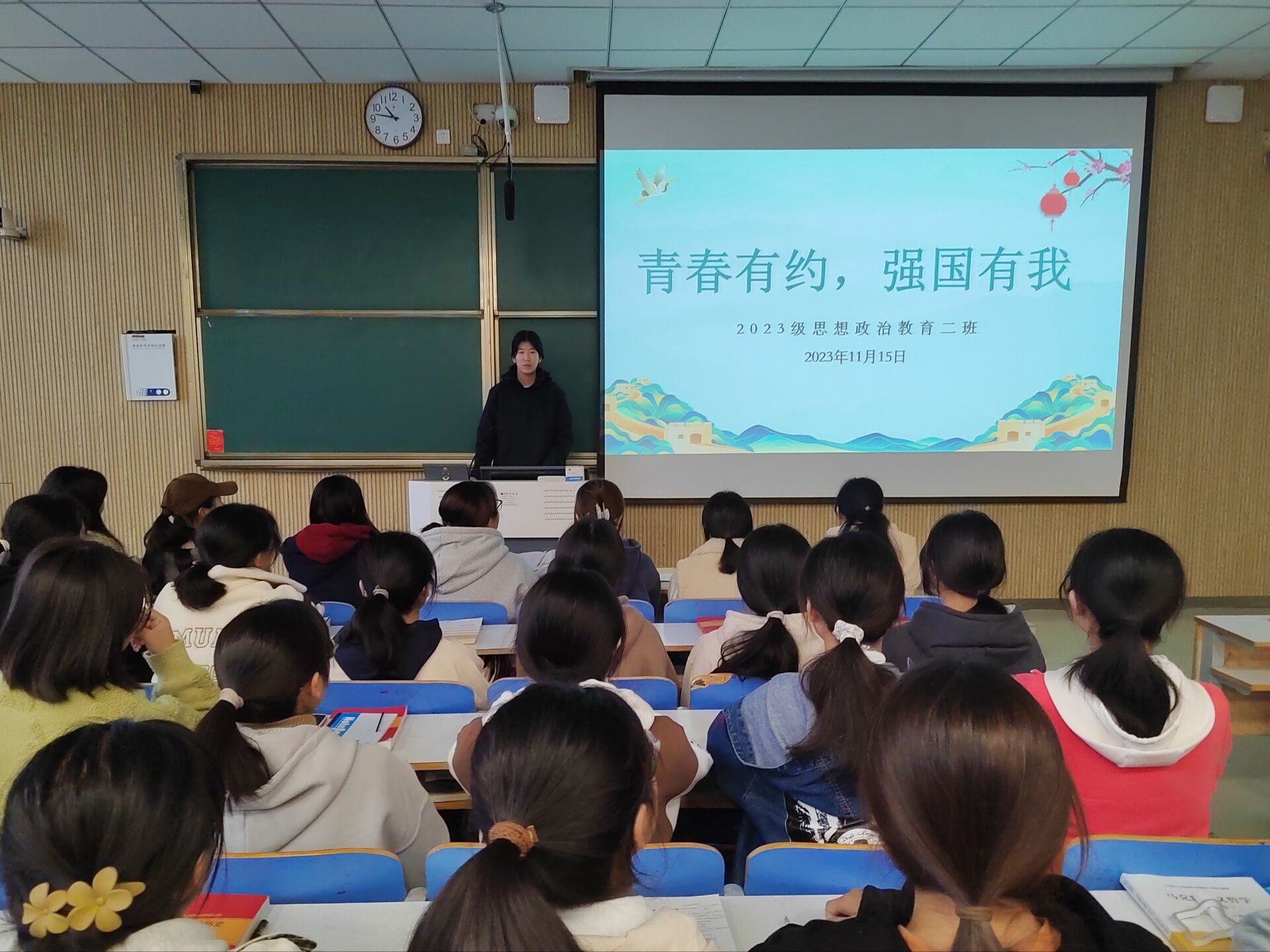 为引导学生坚定听党话、跟党走的崇高信念,用实际行动助力第二个百年奋斗目标,11月15日中午,beat365在线唯一官网思想政治教育二班在社科楼515教室召开“青春有约,强国有我”主题团课。本次团课由团支书王慜初主持。