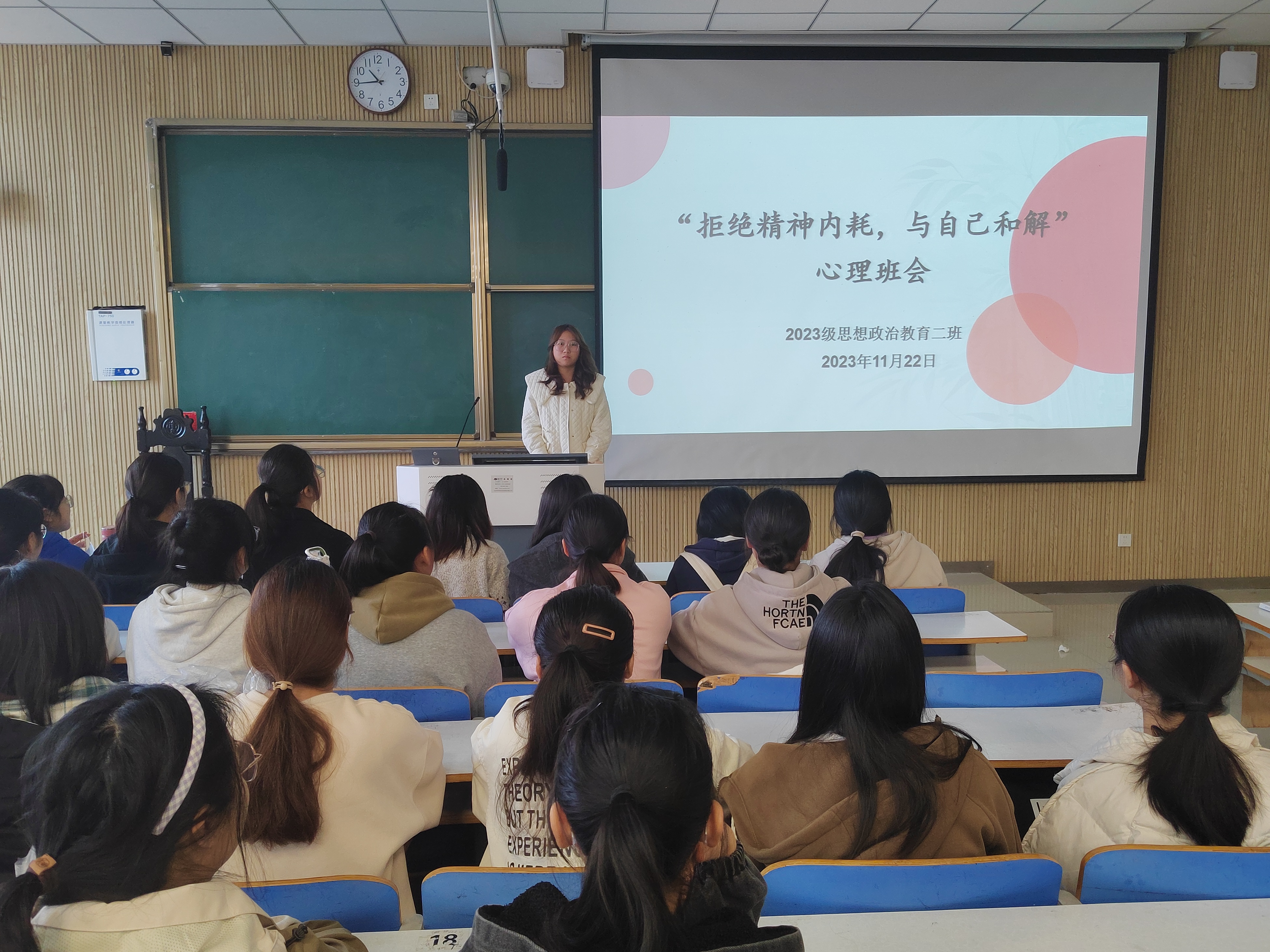 为促进学生心理健康,建立良好的班级氛围,11月22日下午,beat365在线唯一官网2023级思想政治教育二班在社科楼515教室召开“拒绝精神内耗,与自己和解”心理班会。本次心理班会由心理委员李羽欣主持,二班全体同学共同参加。