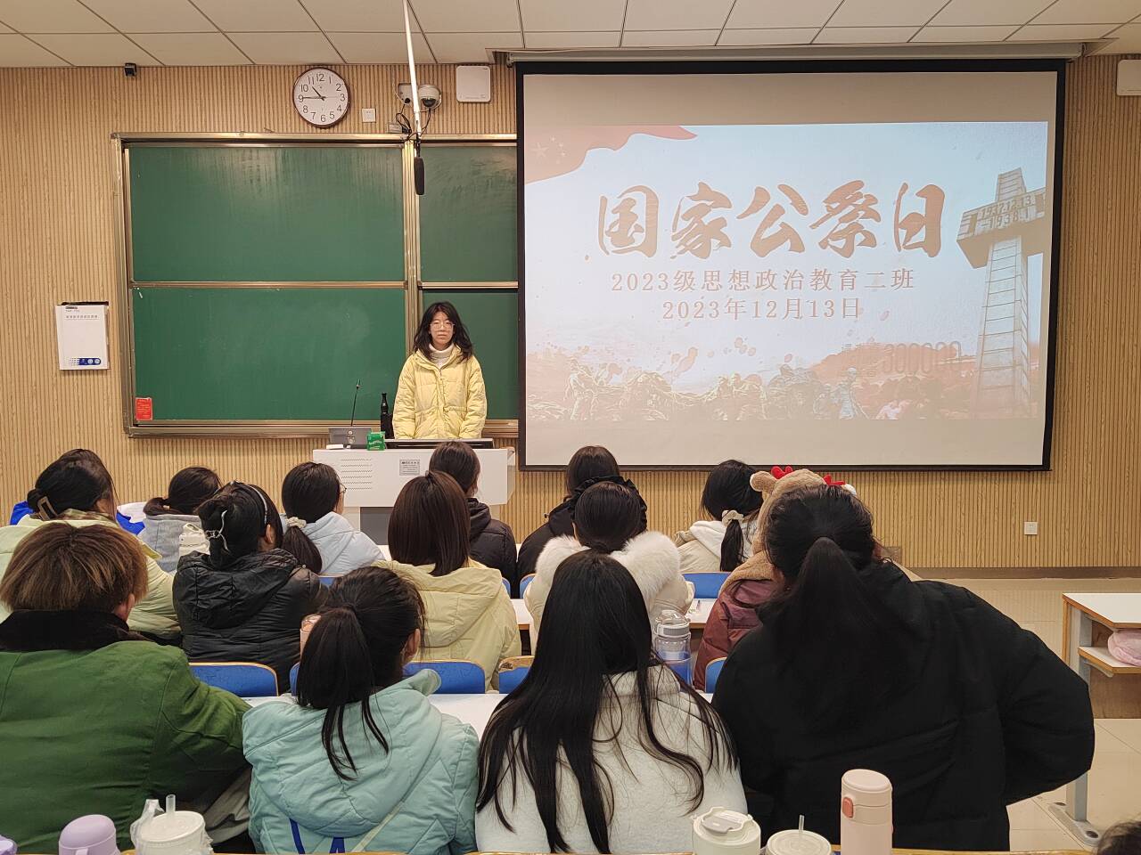 12月13日是南京大屠杀死难者国家公祭日,是为受难者祭奠,为先烈哀悼的日子。团课肇始,王慜初带领同学们回顾了这段伴随苦难的历史,长至四十天的屠杀,多达三十万的冤魂,作为新时代青年的我们,要永远铭记这段历史。接着,王慜初从三个方面,借大量文献,用PPT放映的方式向同学们介绍了“国家公祭日”的创立背景、创立时间及创立意义。她指出,“国家公祭日”的创立,不是为了引起公愤,而是为了铭记国耻;不是为了报复曾经的侵略者,而是为了珍重和平。随后,王慜初带领同学们齐声朗诵《和平宣言》。其中“和平发展,时代主题,民族复兴,世代梦想”的呼声环绕在教室中,体现了二班学生牢记历史,着眼未来,追寻和平的决心。最后,全体同学起立为南京大屠杀遇难者默哀一分钟。默哀礼毕后,王慜初对本次团课活动作出总结,我们作为思政专业的大学生,要坚定维护世界和平的立场,将拳拳爱国之情浇筑在民族精神滥觞之处,做到不忘国耻,振兴中华。