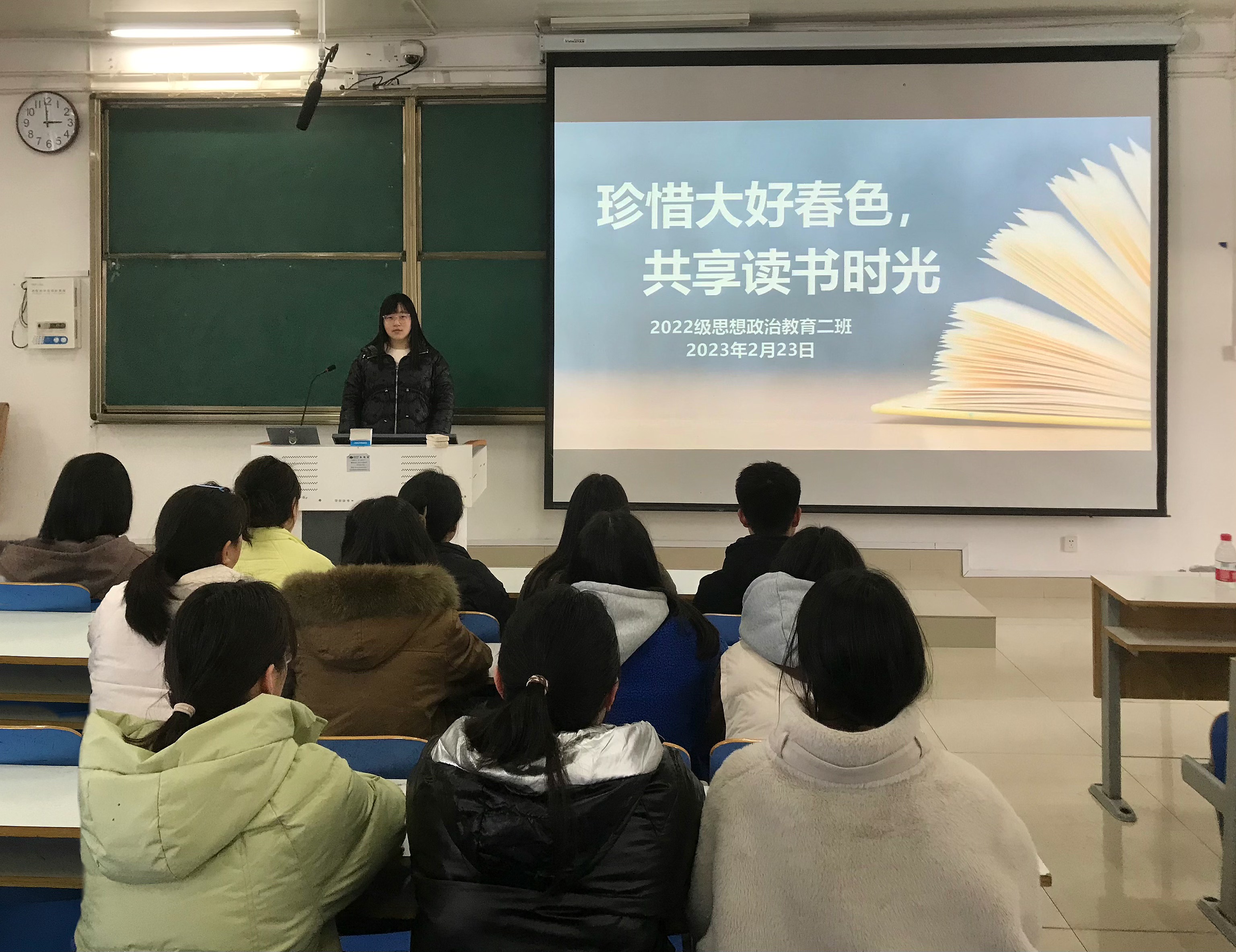 春光明媚好读书,墨韵飘香沁心扉。2月23日下午,beat365在线唯一官网2022级思想政治教育二班在社科楼514教室召开“珍惜大好春色,共享读书时光”主题班会。2022级思想政治教育二班全体同学共同参加会议。班会由班长李佳音主持。