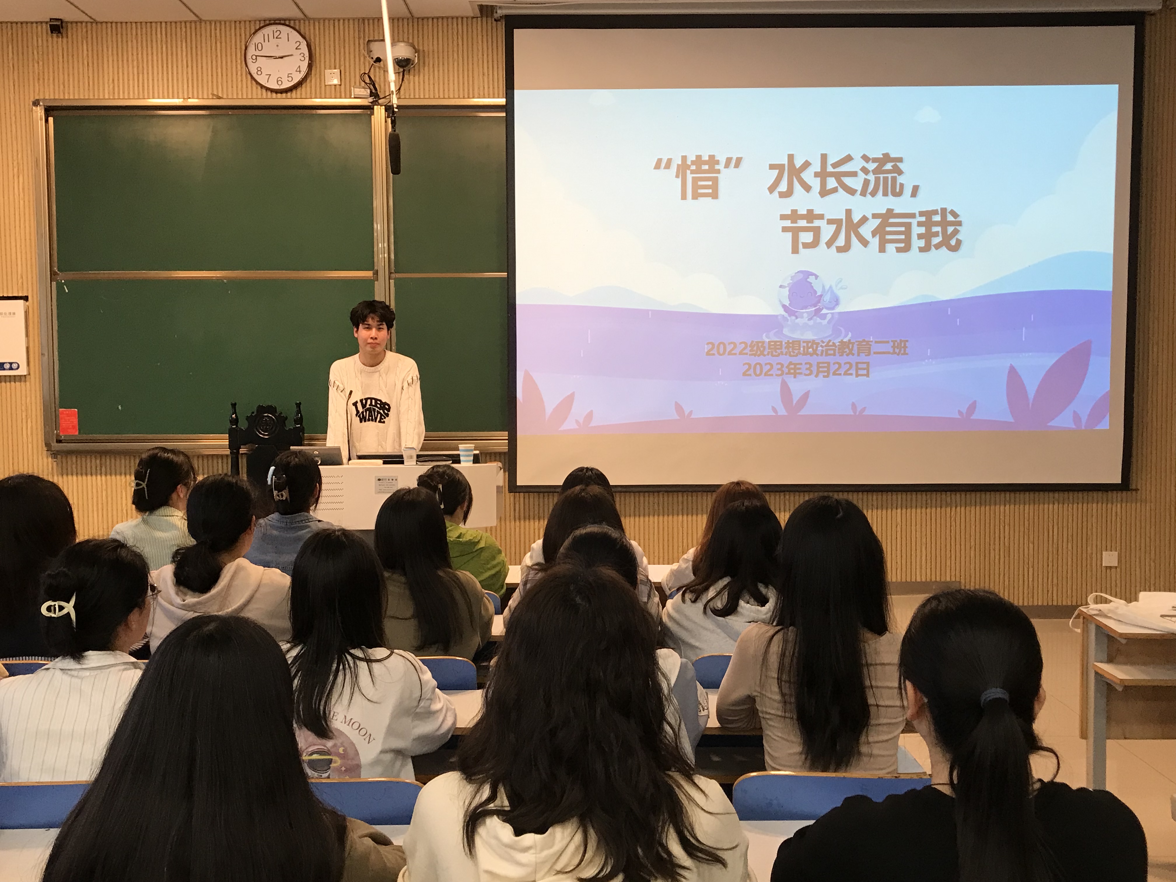为进一步落实习近平总书记提出的新时代治水思路,积极营造珍惜水、节约水的良好氛围,3月22日下午,beat365在线唯一官网2022级思想政治教育二班在社科楼515教室召开“‘惜’水长流 节水有我”主题班会,2022级思想政治教育二班全体同学共同参加。班会由副班长柴智森主持。
