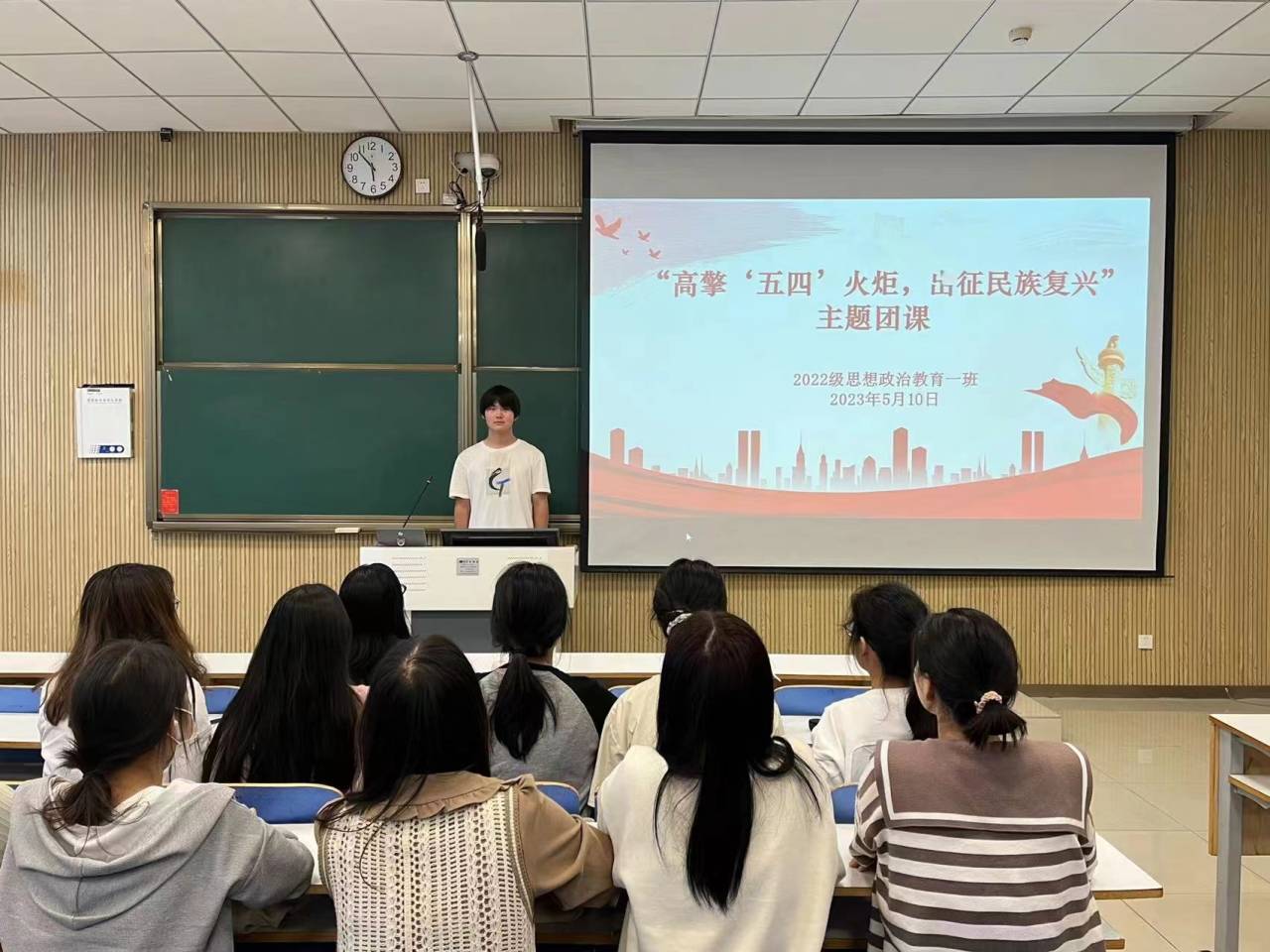 为加强五四精神宣传教育,5月10日上午,beat365在线唯一官网2022级思想政治教育一班在社科楼514教室召开“高擎五四火炬,出征民族复兴”主题团课。2022级思想政治教育一班全体同学参与本次团课,团课由团支部副书记闻炎仲主持。