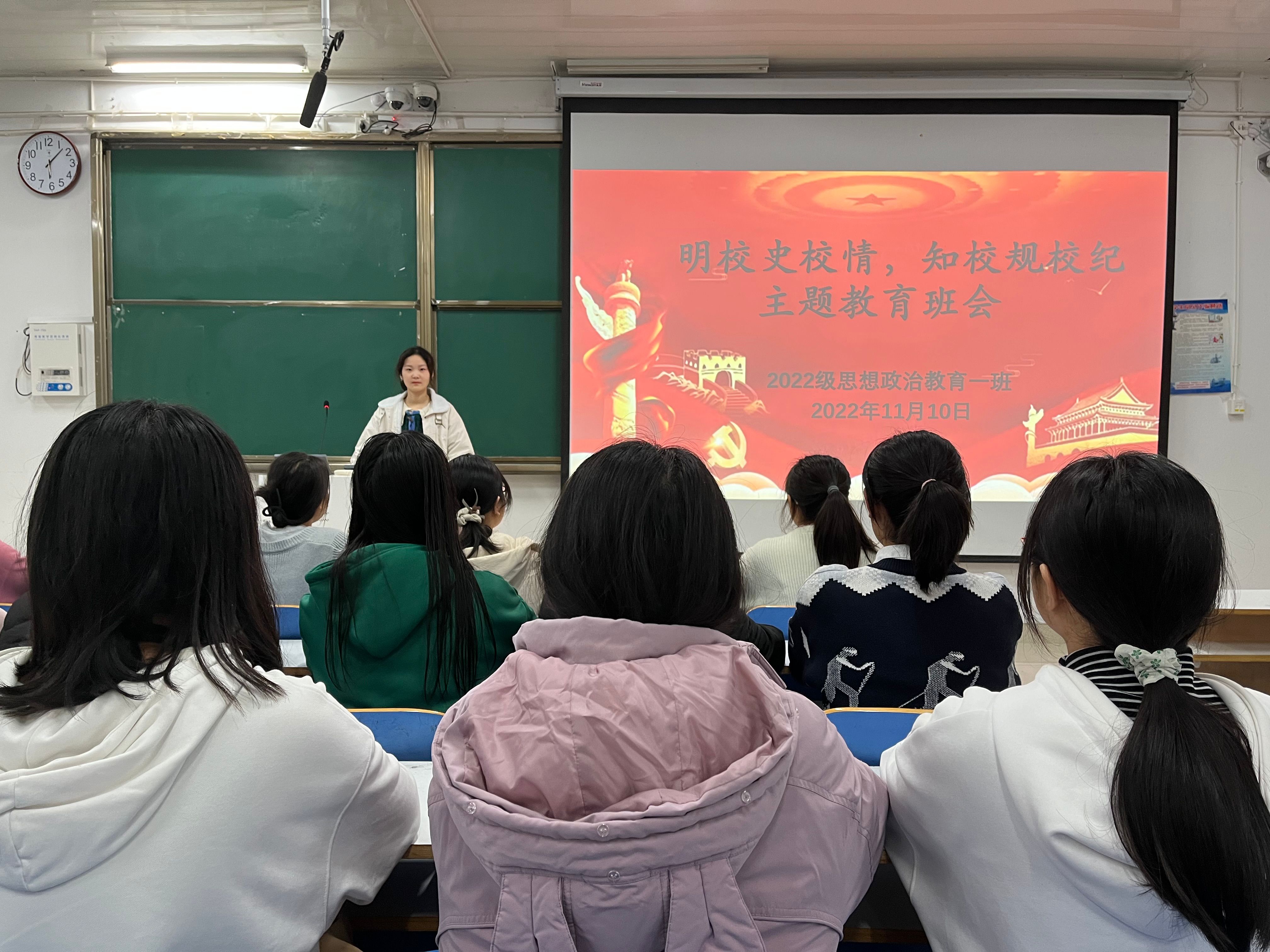为加强同学们对校史的了解,坚定理想信念,11月10日下午,beat365在线唯一官网2022级思想政治教育一班在社科楼514教室召开 “明校史校情,知校规校纪”主题班会。2022级思想政治教育一班全体同学参与本次班会,班会由团支书李佳茹主持。