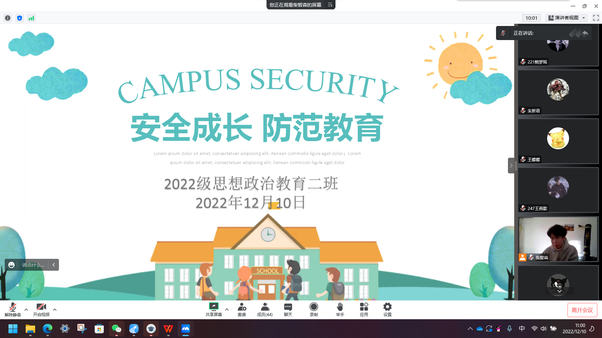 会议伊始,柴智森阐明此次安全稳定教育班会的主题,向同学们着重强调生命安全的重要性。随后,柴智森围绕“消防安全”、“居家运动安全”、“饮食安全”、“网络安全”四个主题带领同学们学习安全知识与技能,并引用以往的安全事故案例以起到警醒作用。最后,柴智森再次重申提高安全意识的重要性,他指出,安全教育是一个永久的话题,即使居家学习,也不能对安全问题有所懈怠,这不仅是对我们生命的负责,更是对家人朋友的负责。生命是宝贵而短暂的,只有在安全中才能永葆活力,时时保安全,事事保安全,我们才能健康成长、学习与生活。