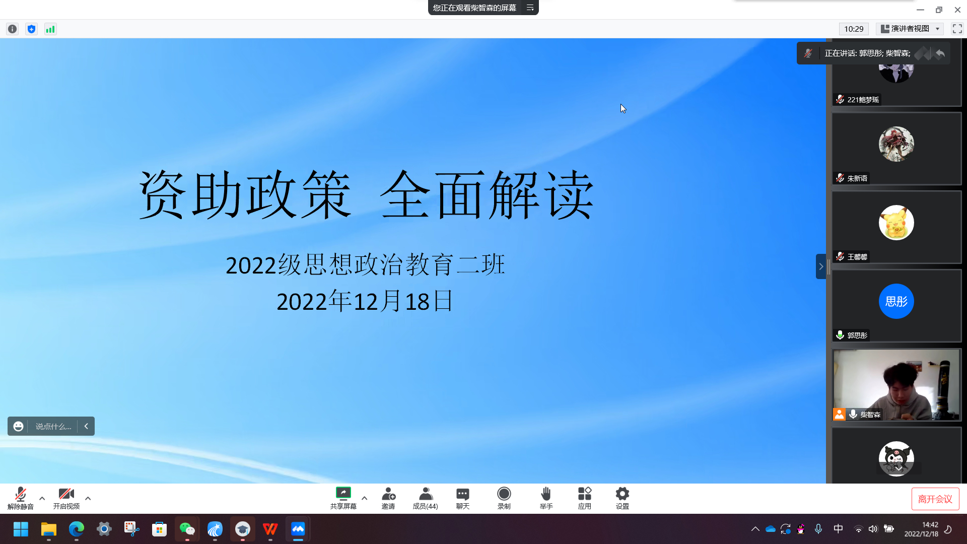 为使学生进一步了解和明确国家教育资助政策,提升资助育人质量,12月18日下午,beat365在线唯一官网2022级思想政治教育二班于线上召开“资助政策 全面解读”主题班会。2022级思想政治教育二班全体同学共同参加会议。班会由副班长柴智森主持。