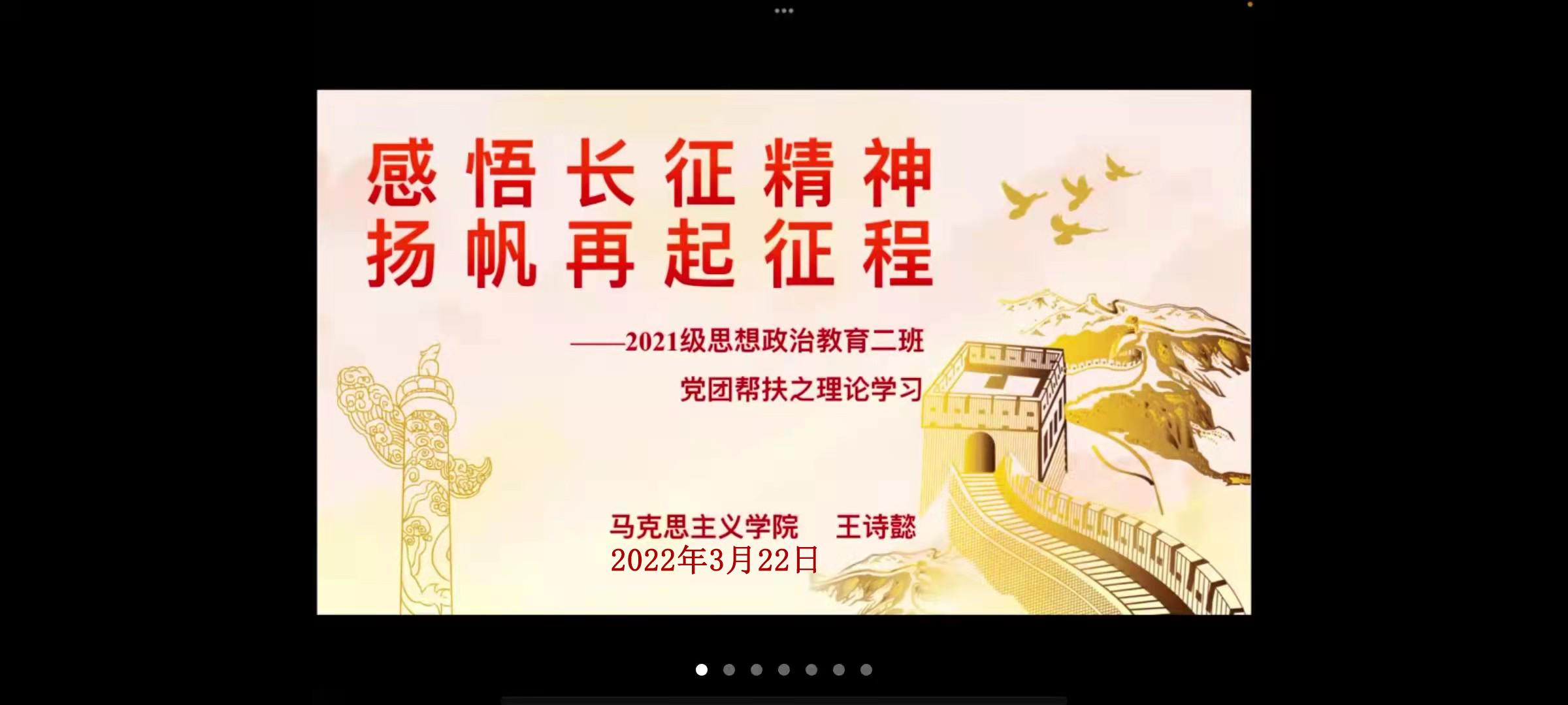 3月22日下午,beat365在线唯一官网2021级思想政治教育二班在腾讯会议举办“感悟长征精神,扬帆再起征程”党团帮扶之理论学习活动。2019级思想政治教育一班预备党员王诗懿、赵佳莹以及2021级思想政治教育二班全体团员参与此次活动,活动由团支书王婧欣主持。