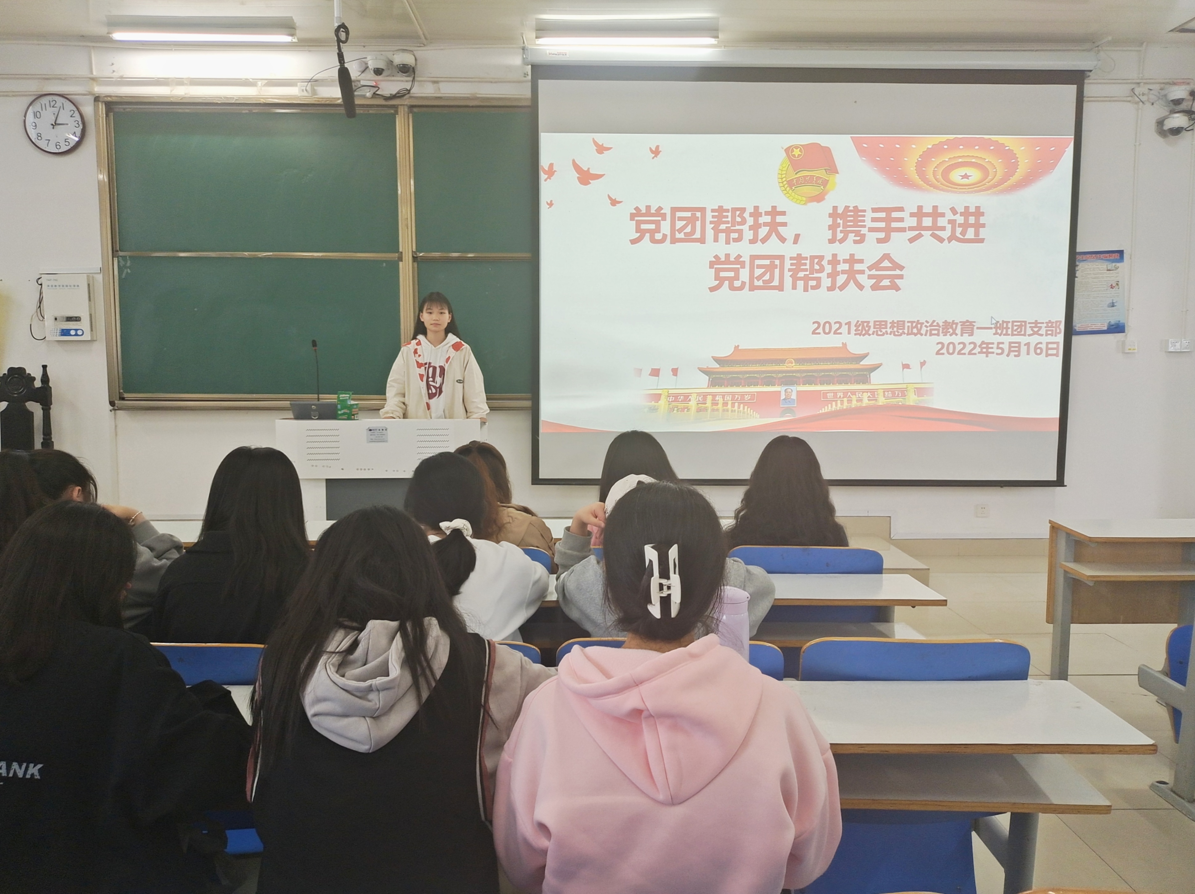 5月16日下午,beat365在线唯一官网2021级思想政治教育一班在社科楼514教室召开“党团帮扶,携手共进”党团帮扶会。2019级思想政治教育一班正式党员刘鹏、宋雨潇以及2021级思想政治教育一班全体团员共同参加了本次会议。会议由团支书戴翰林主持。