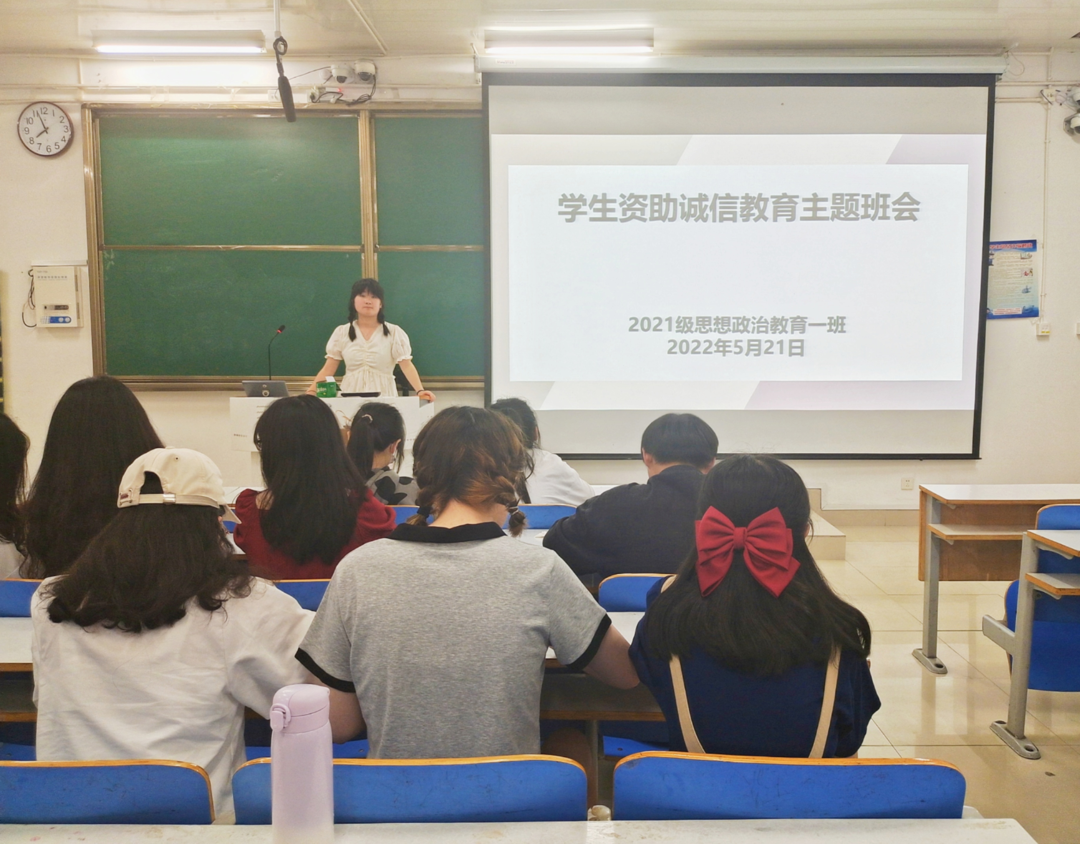 5月21日晚上,beat365在线唯一官网2021级思想政治教育一班再社科楼516教室召开“学生资助诚信教育”主题班会。2021级思想政治教育一班全体成员共同参加了本次班会,班会由副班长雷敏主持。