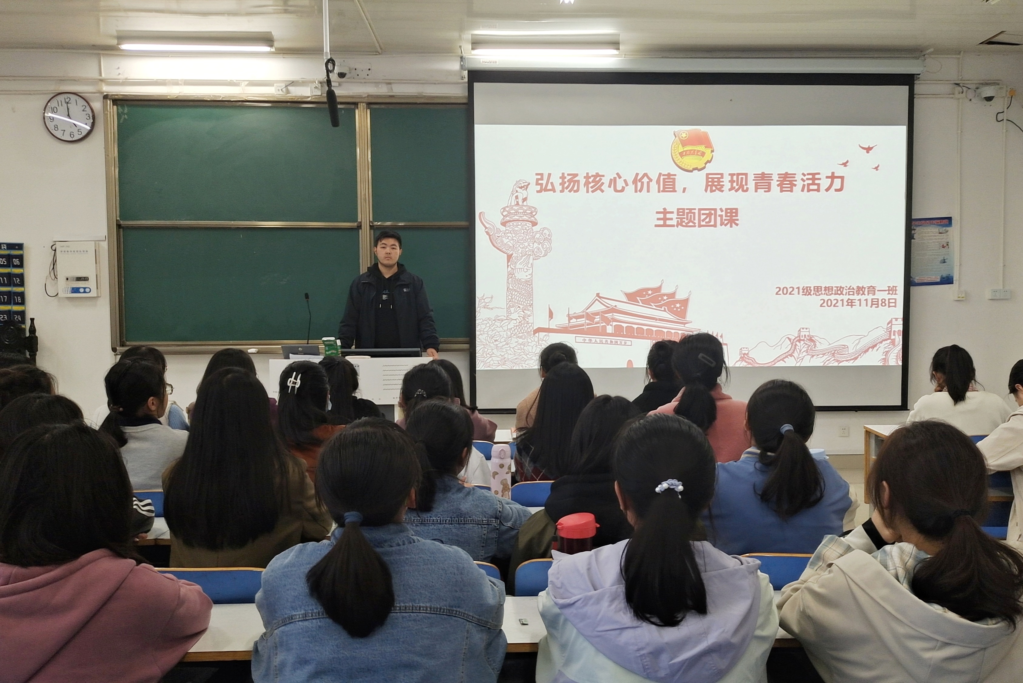 为深入学习贯彻习近平新时代中国特色社会主义思想,引导全体团员牢固树立四个意识,坚定四个自信,11月8日下午,beat365在线唯一官网2021级思想政治教育一班在社科楼516教室召开“弘扬核心价值观,展现青春活力”主题团课。2021级思想政治教育一班全体团员参加本次团课。团课由团支书戴翰林主持。