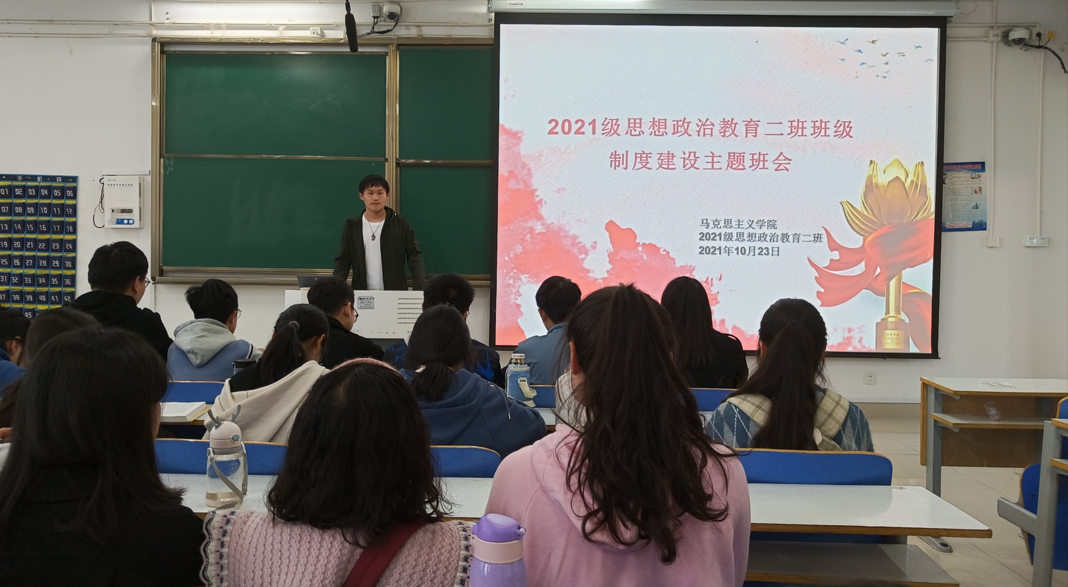 班会伊始,副班长任振豪指出此次班会分为唱团歌、团支部书记汇报工作、团支部团员进行发言、上级团组织负责人或者本级团组织负责人点评讲话、重温入团誓词等几个环节。接着,2021级思想政治教育二班全体同学起立高唱团歌。随后,团支书王婧欣进行工作汇报,她对习近平在纪念五四运动100周年大会上的讲话展开分析,她指出青年是整个社会力量中最积极的力量,国家的希望在青年,民族的未来在青年。今天,新时代的青年处在中华民族发展的最好时期,我们要理想远大、信念坚定。最后,辅导员周文豪对班会进行总结,他强调共青团是党的助手和后备军,是党的青年工作的重要力量,我们一定要贯彻落实习近平总书记关于青年工作的重要思想,加强党的创新理论学习教育,坚持读原著、学原文、悟原理,努力做到学思用贯通、知信行统一。