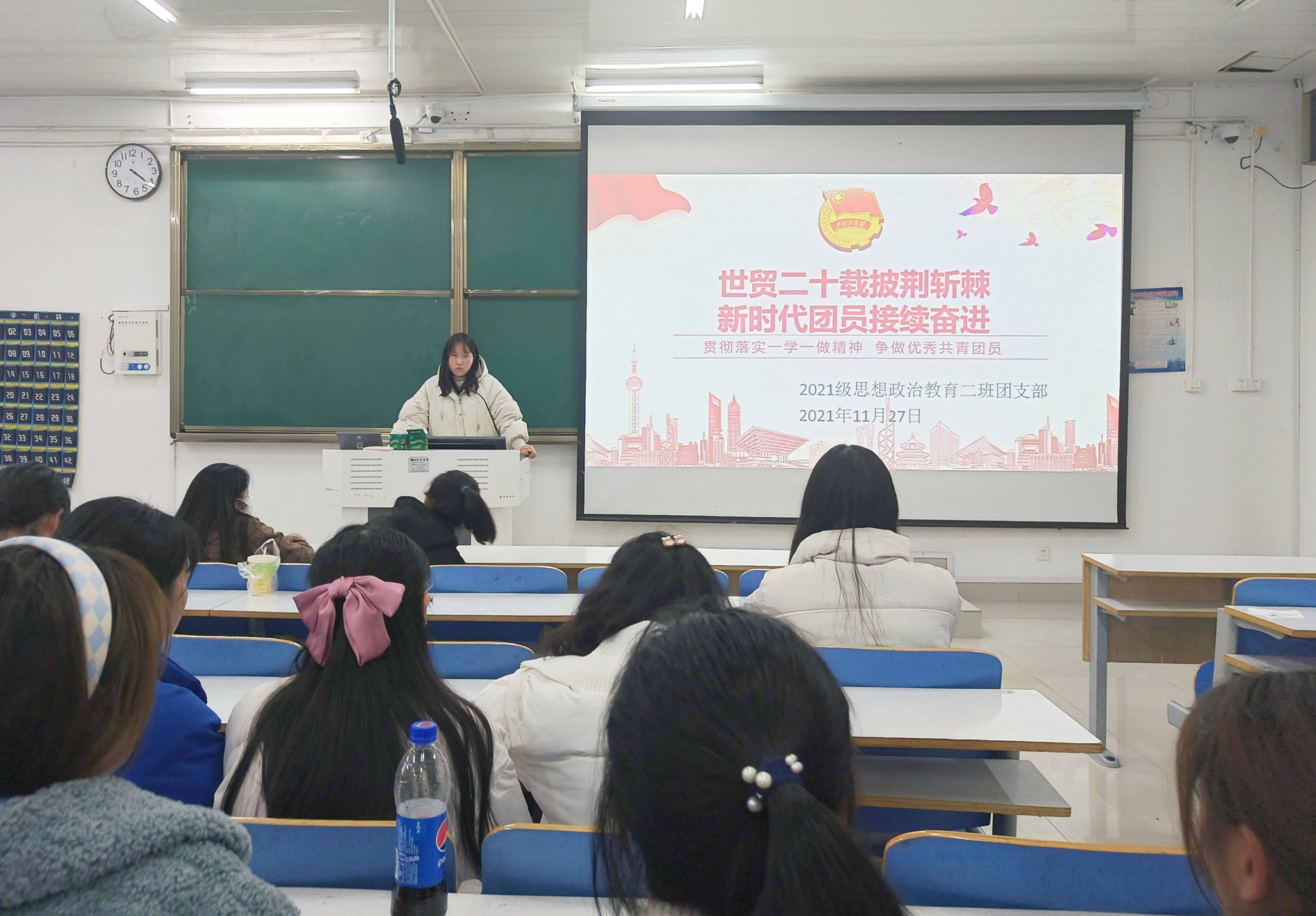 11月27日晚上,beat365在线唯一官网2021级思想政治教育二班在社科楼514教室召开“世贸二十载披荆斩棘,新时代团员接续奋进”主题团课。2021级思想政治教育二班全体同学参加此次团课,团课由团支书王婧欣主持。