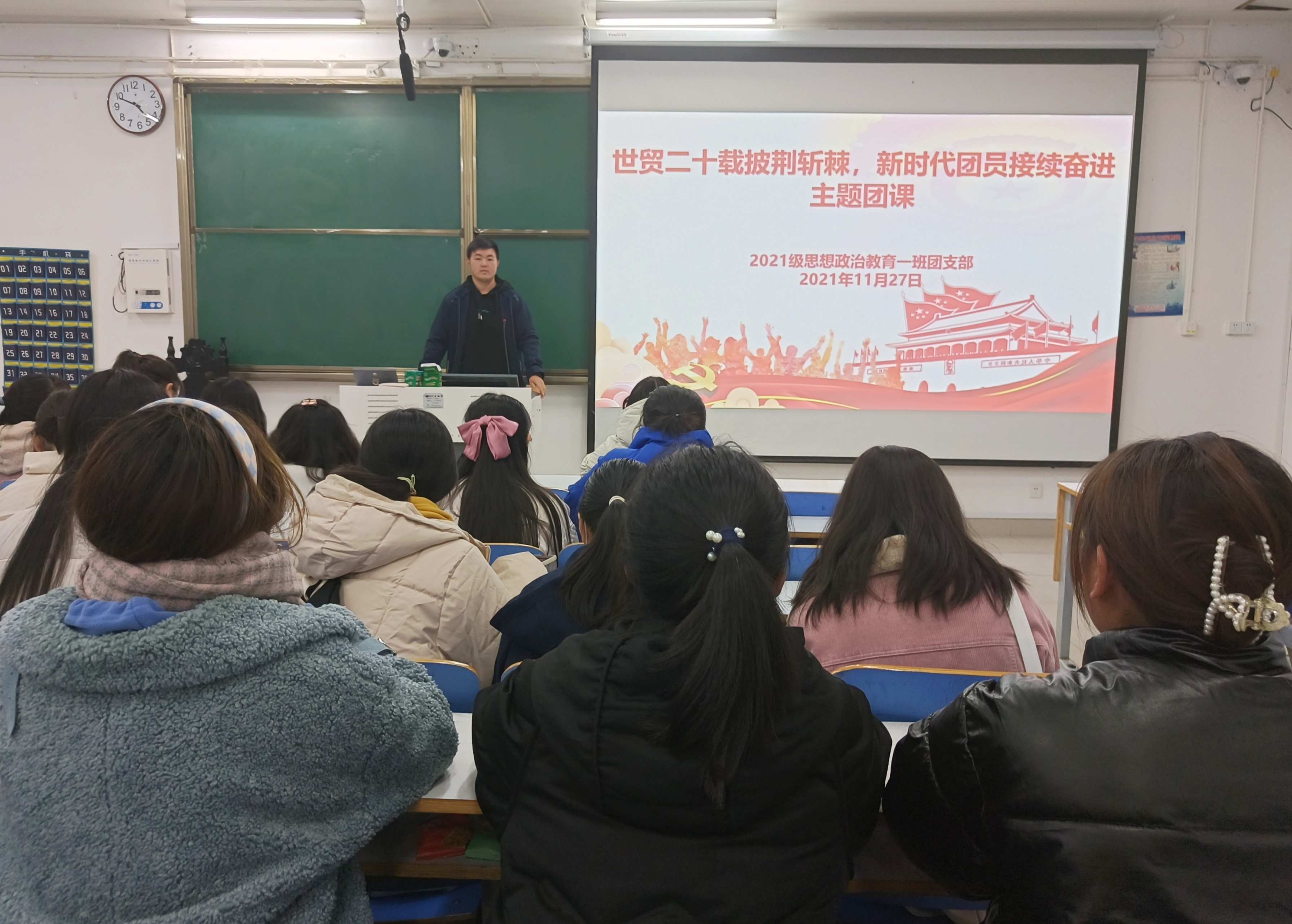 11月27日上午,马克主义学院2021级思想政治教育一班在社科楼514教室召开“世贸二十载披荆斩棘,新时代团员接续奋进”主题团课。2021级思想政治教育一班全体团员共同参与本次团课。团课由团支书戴翰林主持。