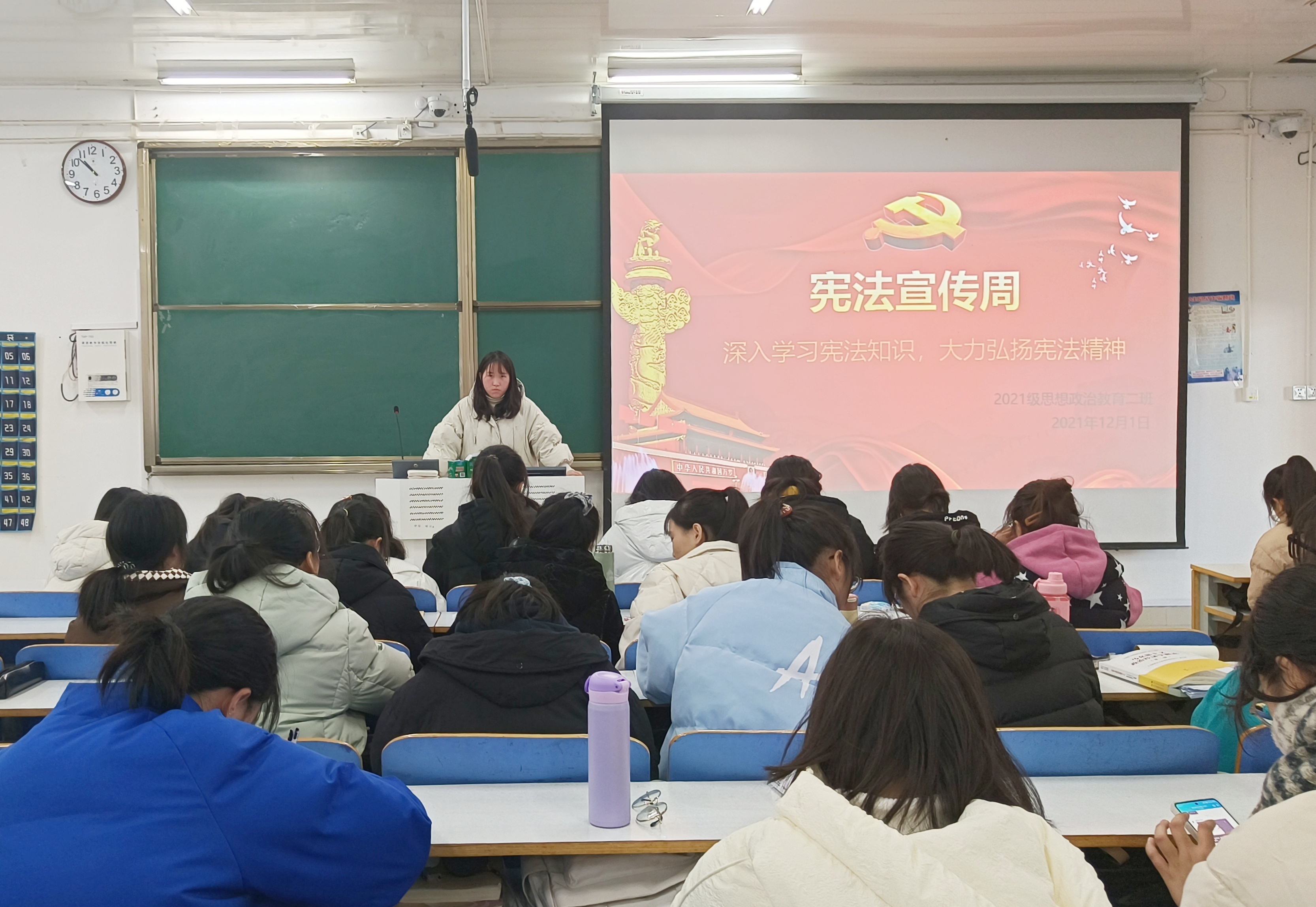 12月1日上午,beat365在线唯一官网2021级思想政治教育二班宪法宣传周主题班会在社科楼514教室召开。2021级思想政治教育二班全体同学参加此次班会,班会由团支书王婧欣主持。