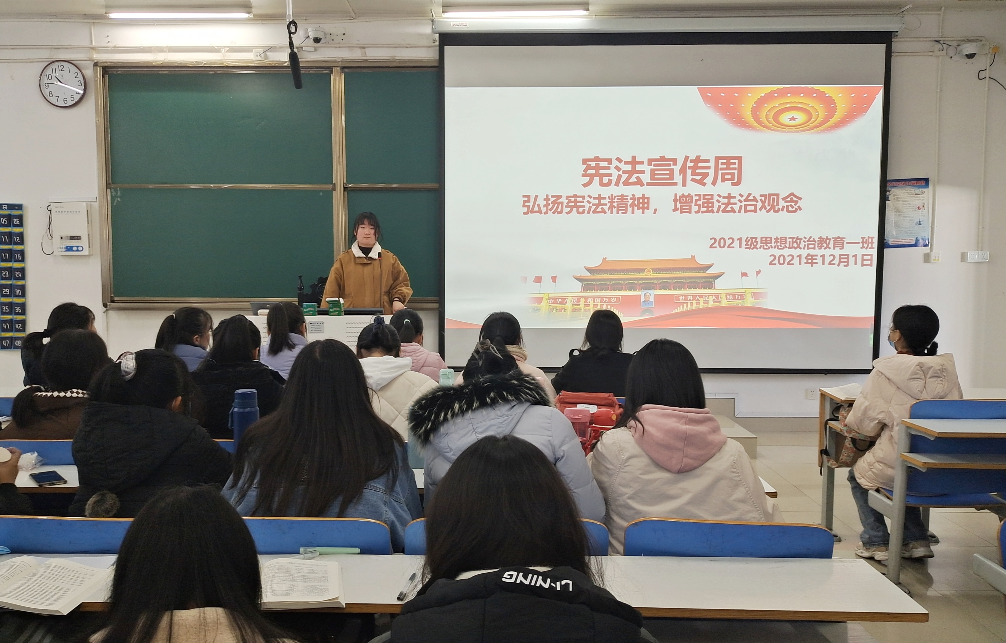 为增强同学们的法治观念,学习贯彻宪法精神,12月1日上午,beat365在线唯一官网2021级思想政治教育一班在社科楼514教室召开“弘扬宪法精神,增强法治观念”主题班会。2021级思想政治教育一班全体成员参加本次班会。班会由副班长雷敏主持。