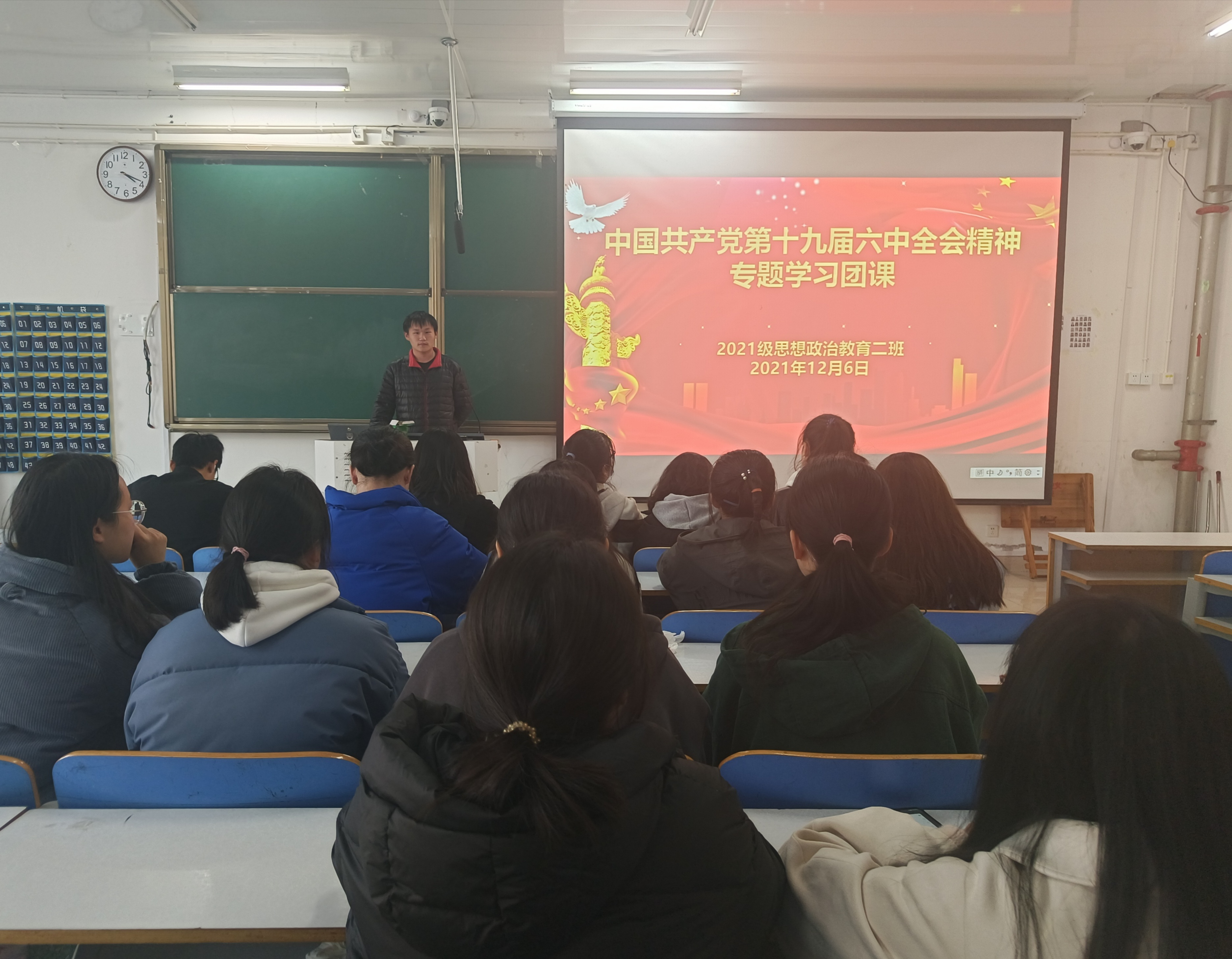 12月6日下午,beat365在线唯一官网2021级思想政治教育二班中国共产党第十九届六中全会精神专题学习团课在社科楼514教室召开。2021级思想政治教育二班全体同学参加此次团课。团课由团支部副书记任振豪主持。