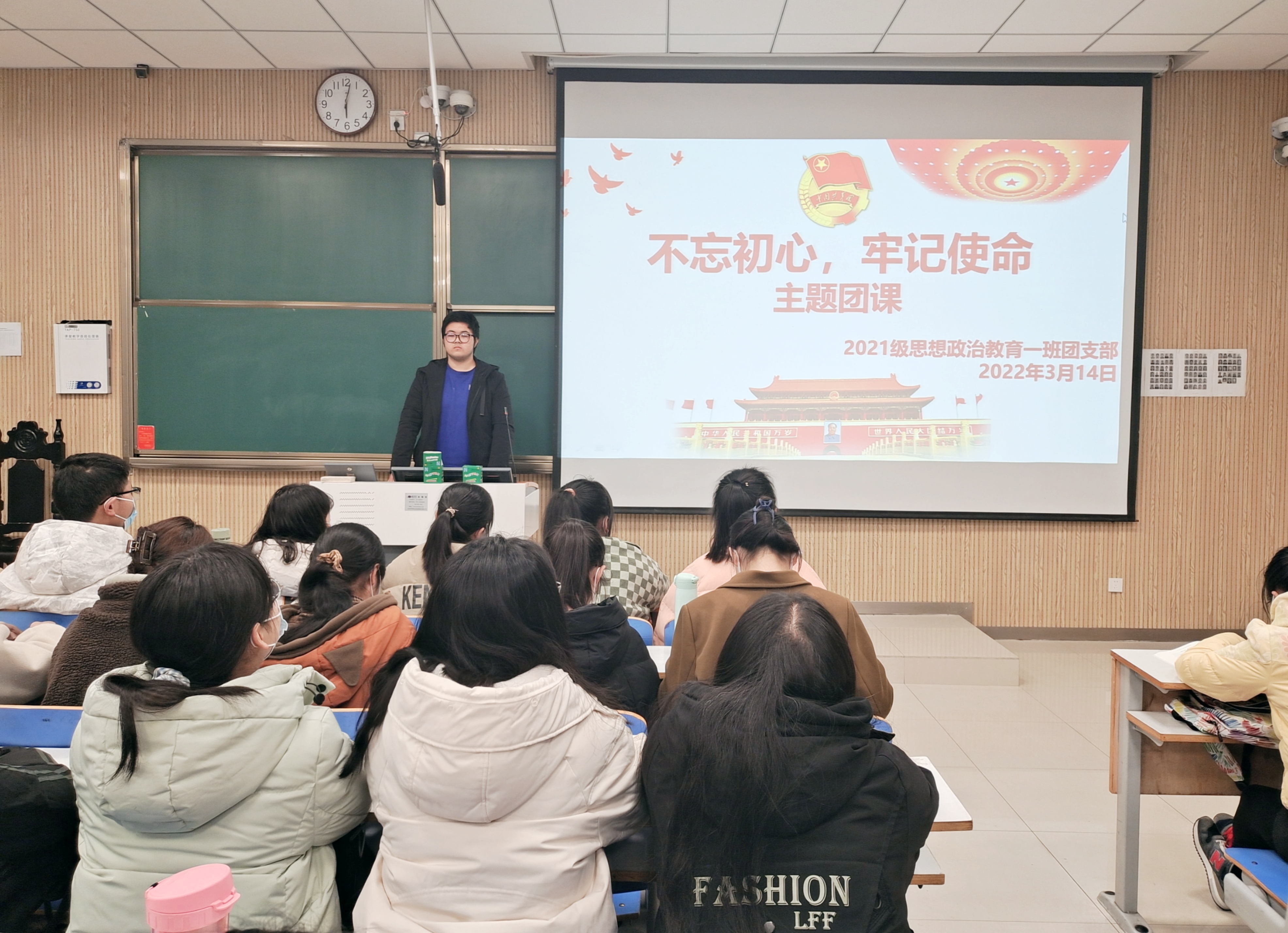 3月14日下午,beat365在线唯一官网2021级思想政治教育一班在社科楼515开展“不忘初心,牢记使命”主题团课。2021级思想政治教育一班全体团员共同参加了本次会议。会议由团支书戴翰林主持。