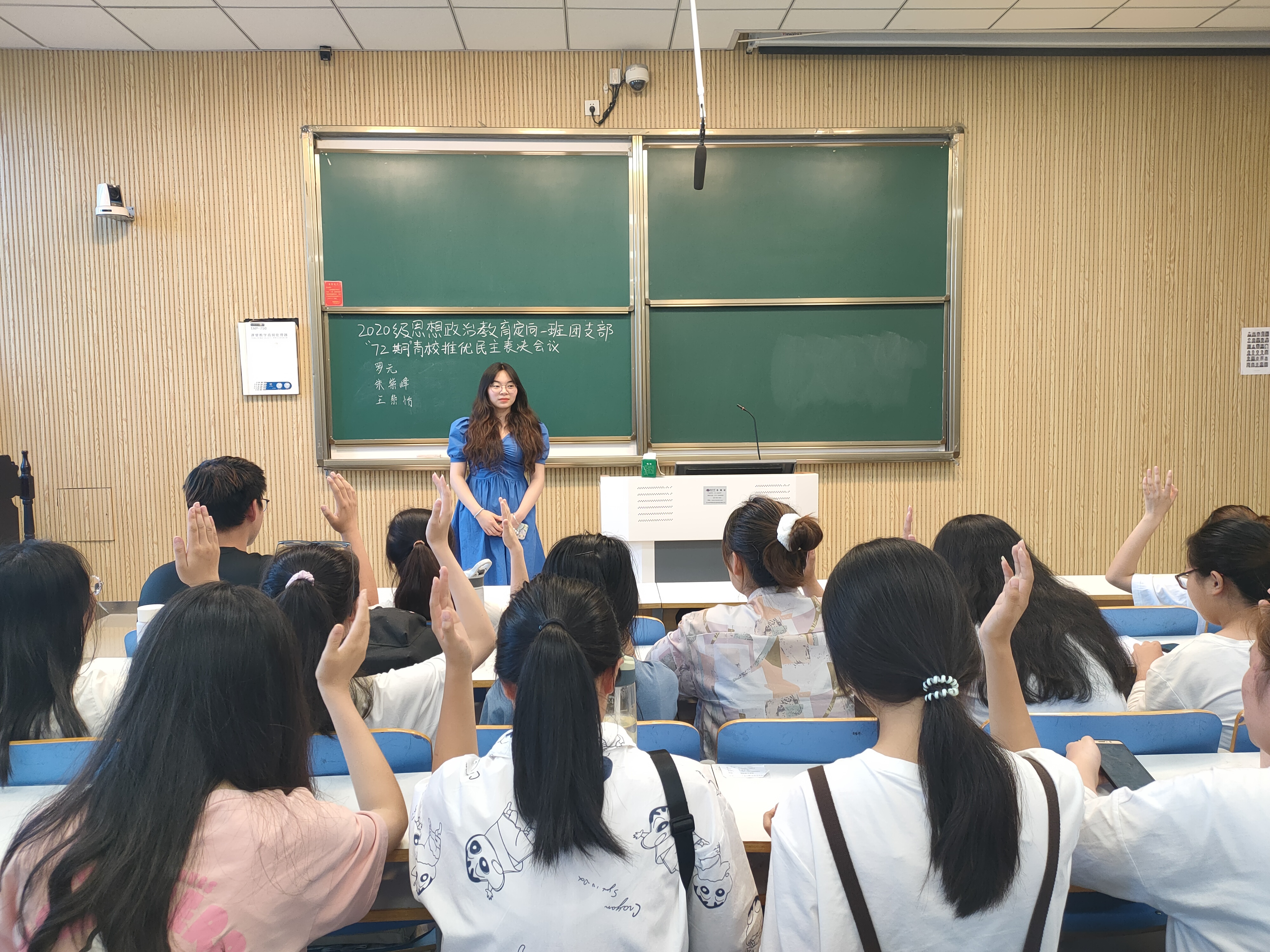 会议伊始,王晨向同学们讲解了本次会议的主要目的是讨论推选优秀青校成员。我班推选候选人共有三名,分别为罗元、朱紫峰、王紫怡。经过大一一年的相处,全体同学对这三位同学的学习情况和个人作风都有充分的了解和认识。全体成员都秉着公平公正的原则进行本次选举工作。本次表决采取举手表决的方式,分为同意表决和反对表决。在王晨同学的主持下,选举工作顺利有序的进行。全体同学对罗元、朱紫峰、王紫怡的学习和生活作风给予一致肯定,无人投反对票。推选罗元、朱紫峰、王紫怡三位同学为优秀青校成员。此次会议画上了圆满的句号。