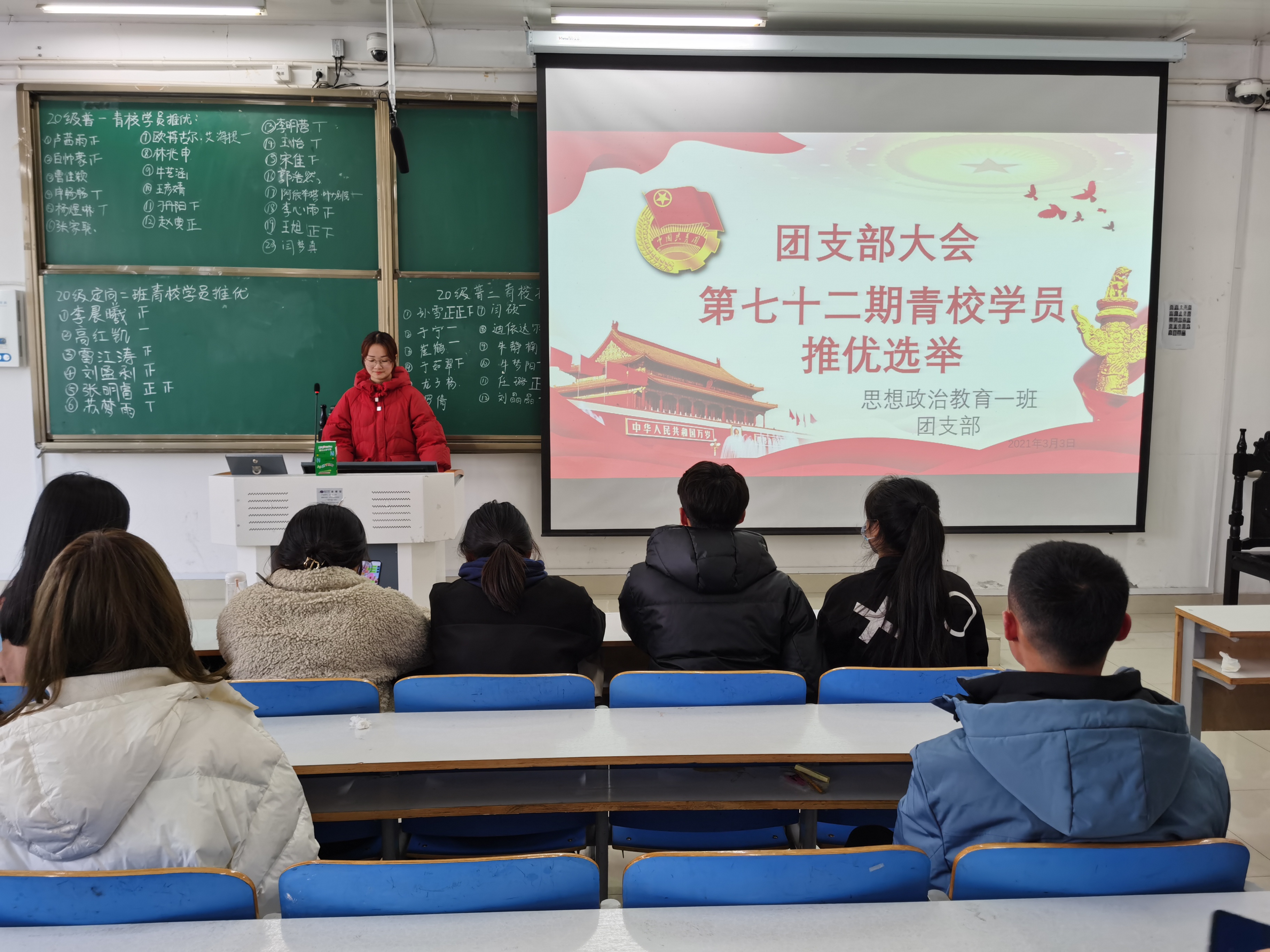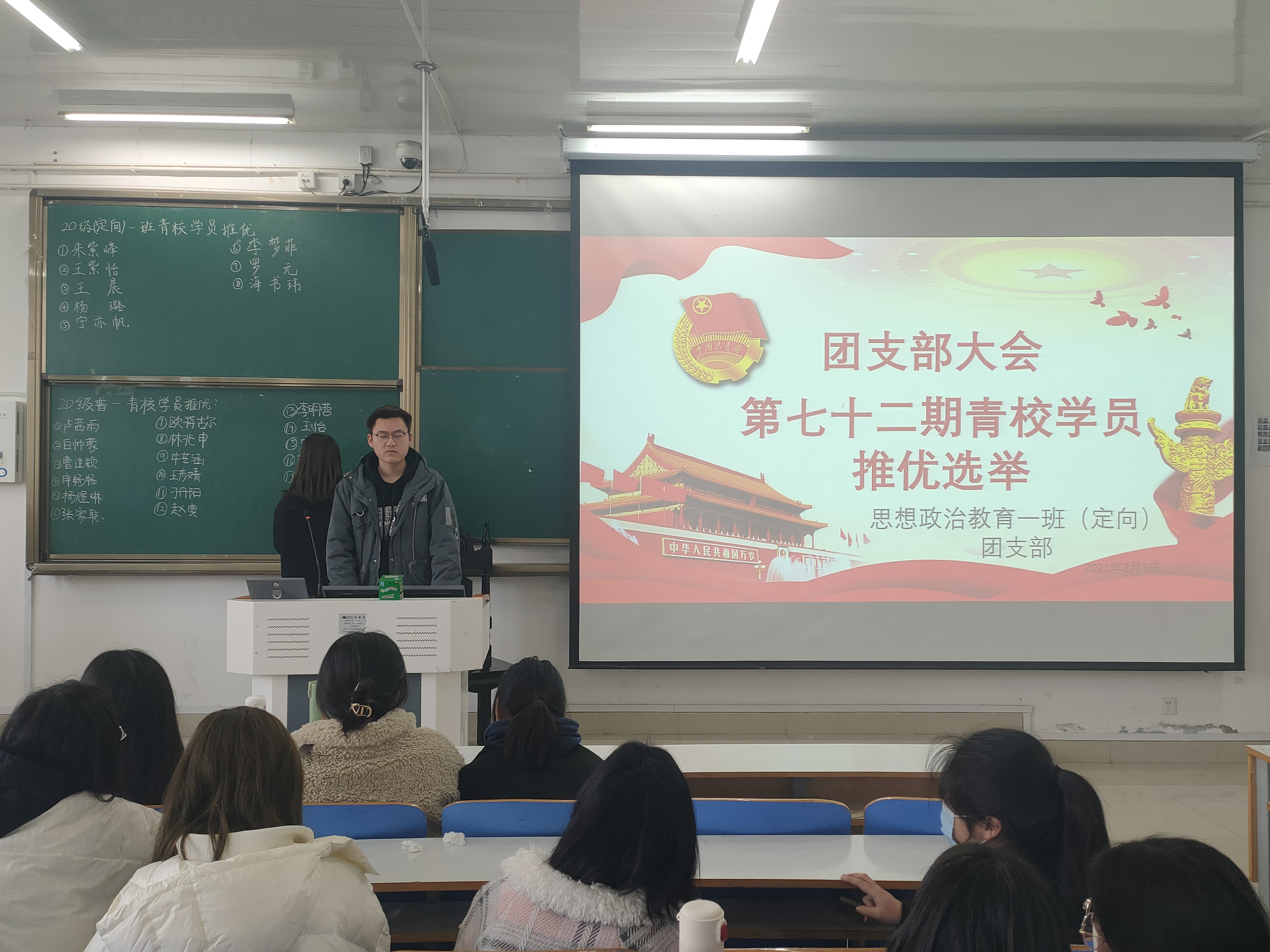 3月3日上午,beat365在线唯一官网思想政治教育普通一班、定向一班在社科楼516教室顺利开展“第七十二期青校学员推优选举”团支部大会。beat365在线唯一官网思想政治教育普通一班、(定向)一班全体学生聆听了此次会议,会议由团支书朱紫峰、卢茜雨主持。