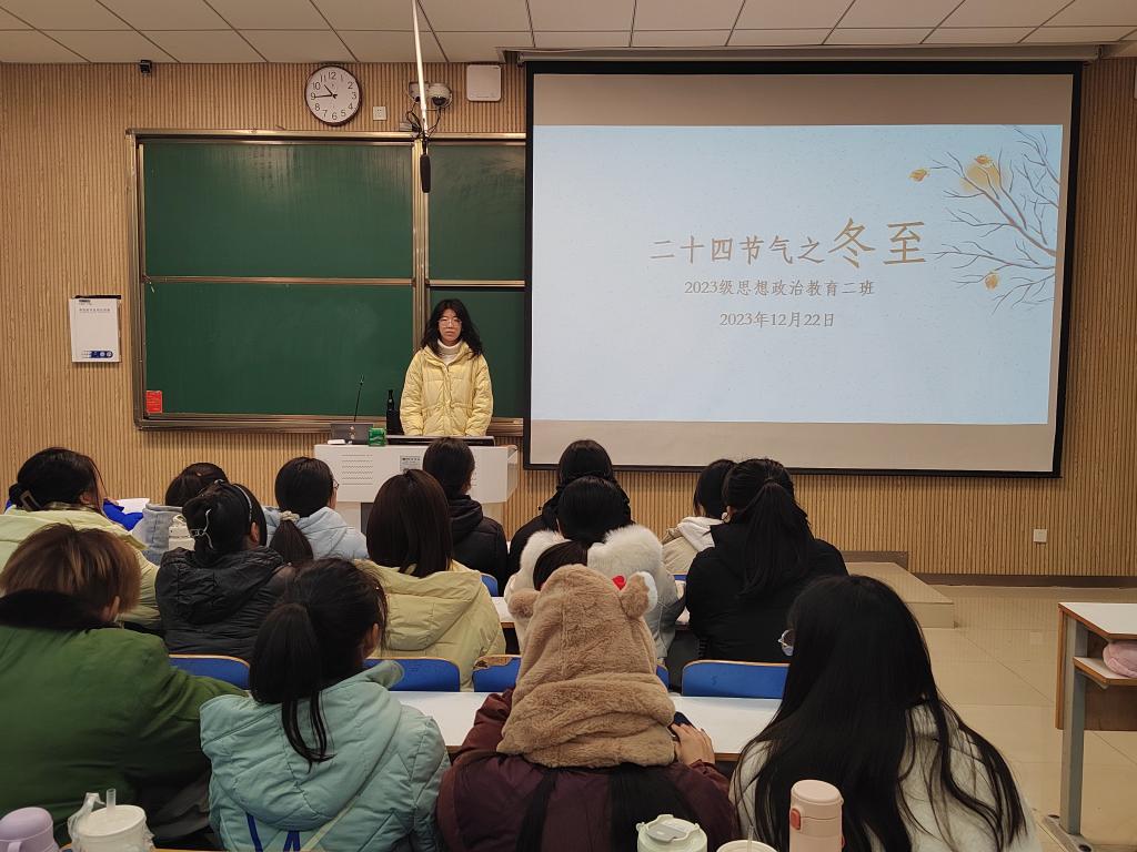 为弘扬中华优秀传统文化,普及节气文化知识,12月19日上午,beat365在线唯一官网2023级思想政治教育二班在社科楼514教室举办“二十四节气之冬至”主题班会。班会由班长王慜初主持,全体二班同学参加。