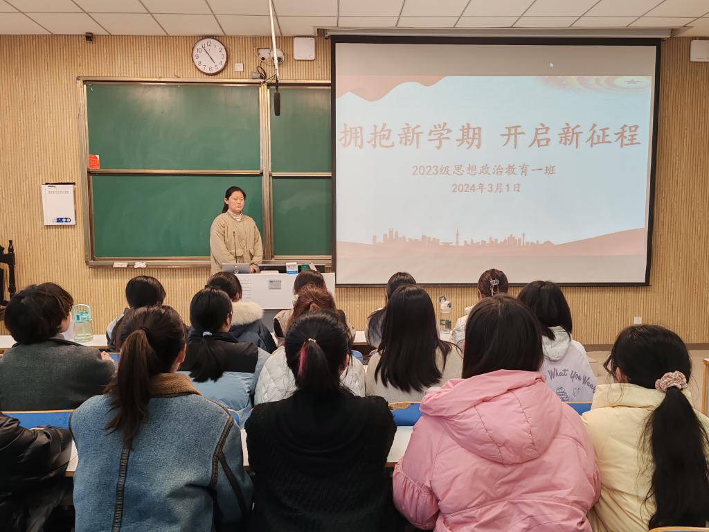 为更好地迎接新学期的到来,顺利开展各项工作,3月1日上午,beat365在线唯一官网2023级思想政治教育一班在社科楼515教室召开“拥抱新学期,开启新征程”主题班会。beat3652023级思想政治教育一班全体同学共同参与本次班会,班会由团支书张卓主持。