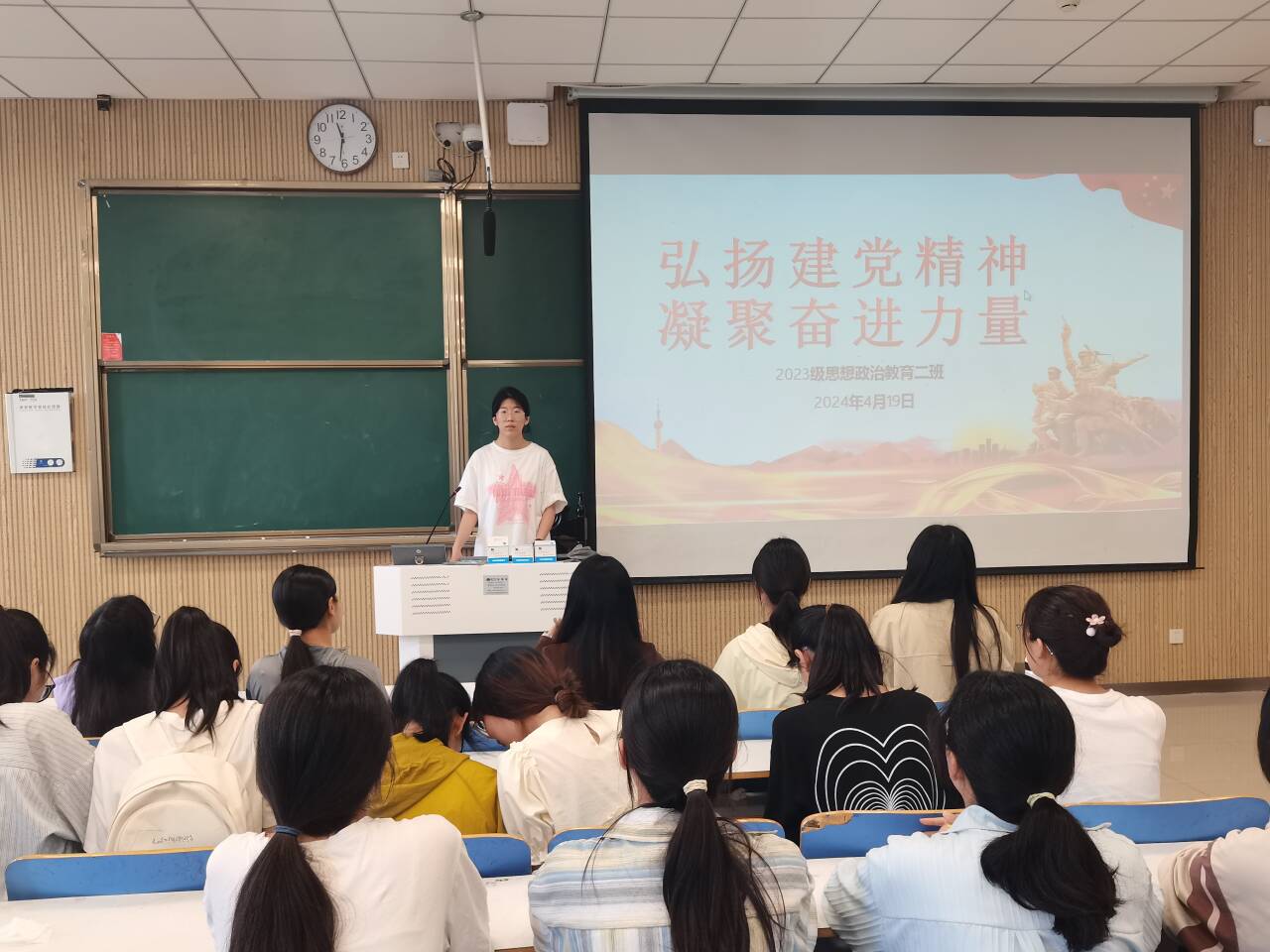 为弘扬伟大建党精神,确保广大青年大学生始终坚持听党话、跟党走,4月16日下午,beat365在线唯一官网2023级思想政治教育二班在社科楼515教室召开“弘扬建党精神,凝聚奋进力量”主题团课。本次主题团课由团支书王慜初主持,全体二班同学参加。