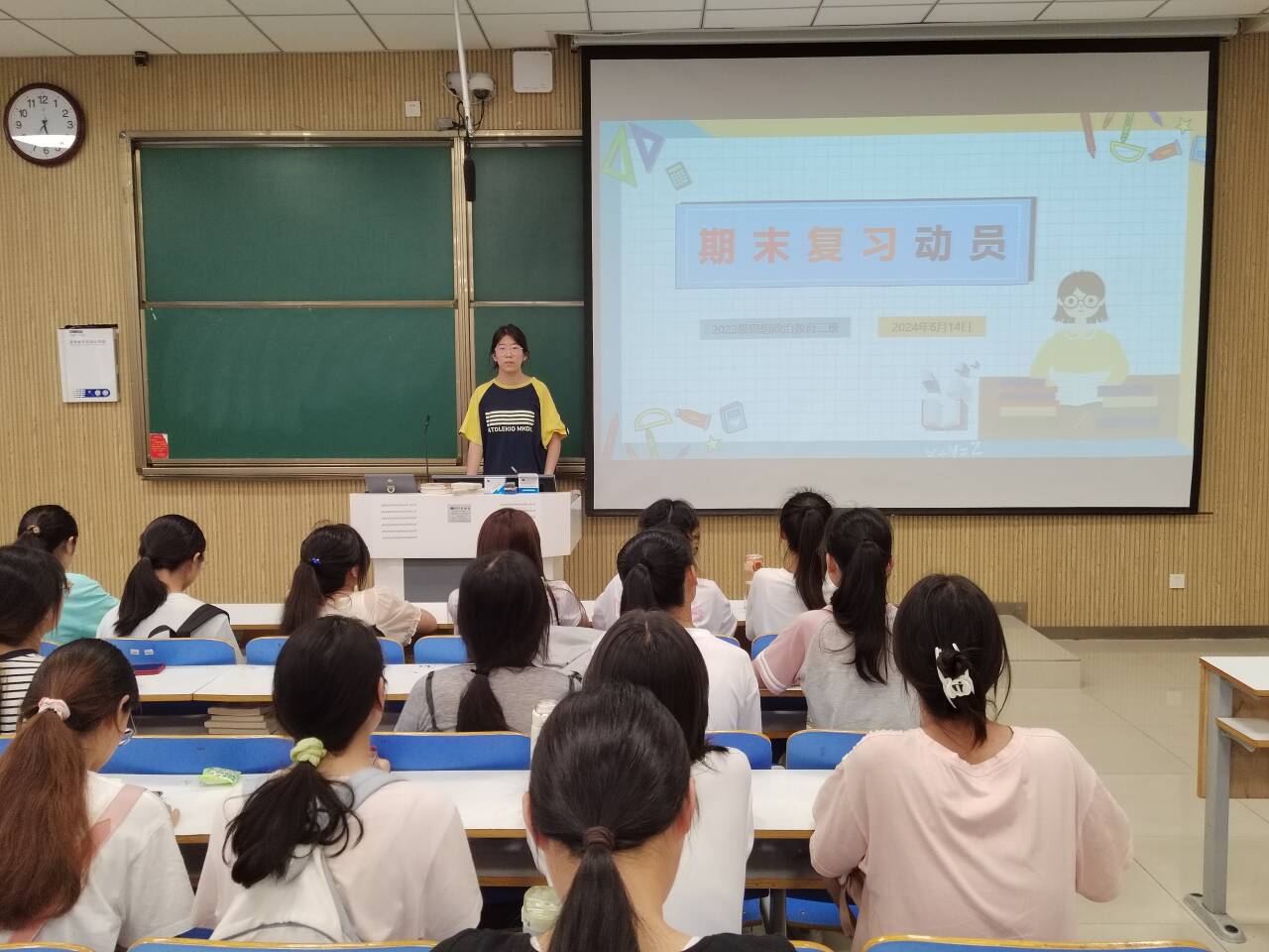 班会肇始,王慜初借助PPT的形式向同学们列出了期末考试的科目、时间与具体注意事项。她强调,期末考试是对一个学期以来教和学的总结,是对大学生学习成果的重要检验,同学们需要充分认识到本次考试的重要性,做好期末复习工作。从6月20日开始正式考试,在这近一周的复习时间中同学们要做到有效利用复习时间,坚持具体问题具体分析,树立适合自身的复习方法和策略,将复习重心放到相对生疏的科目上,针对薄弱科目进行重点复习,做到查漏补缺,提高自身成绩上限。王慜初表示,期末复习最重要的作用是整合本学期所学知识,搭建完善的知识体系,从而在考试中取得较好的成绩。在上学期的期末考试中,二班取得了较好的成绩,及格率位居年级最高,希望同学们在本学期期末考试中仍然能够保持佳绩。