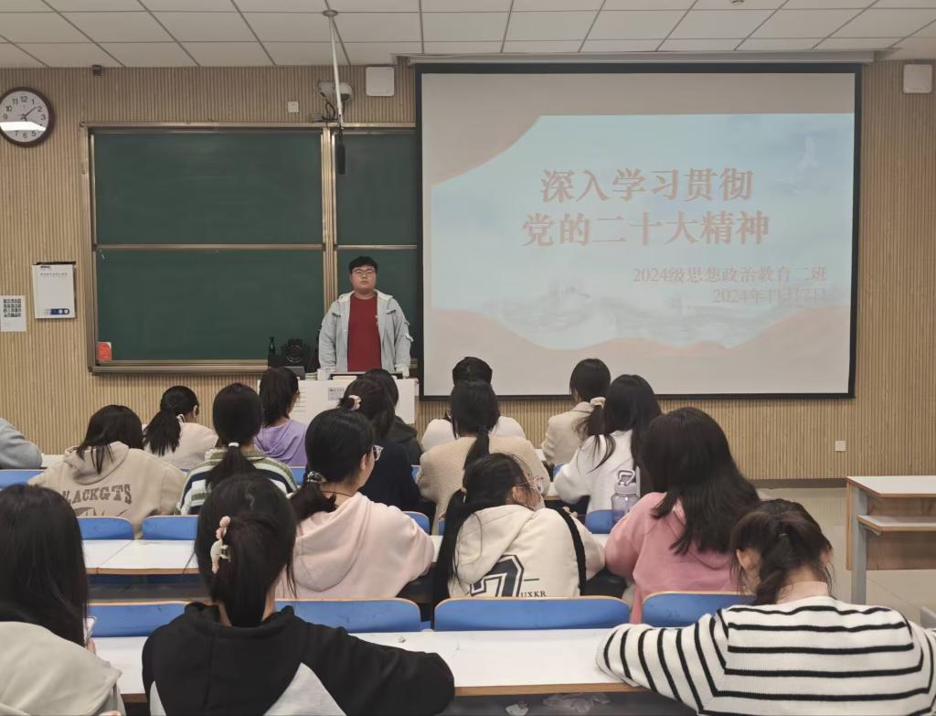 为让青年深刻领会党的二十大精神实质和丰富内涵,增强对党的路线方针政策的理解和认同,提高政治觉悟和政治能力,11月7日下午,beat365在线唯一官网 2024 级思想政治教育二班于社科楼515教室举办了 “深入学习贯彻党的二十大精神”主题团课活动。此次团课由团支书王志颖主持,二班全体同学共同参与。