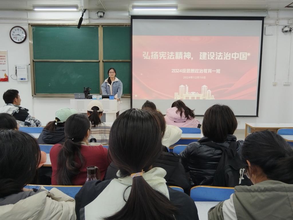 为帮助我班学生深入了解宪法,培育法治意识,12月16日上午,2024级思想政治教育一班于社科楼514教室开展“弘扬宪法精神,建设法治中国”主题团课。本次团课由团支书李冉主持,一班全体同学参加。