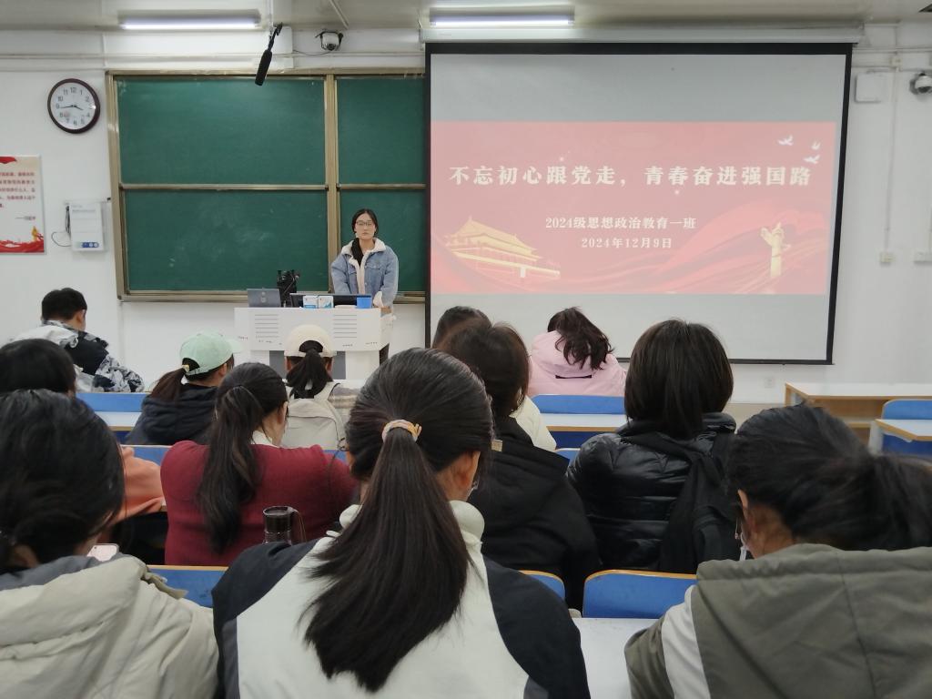 为引导我班学生深入学习党的历史,增强党性修养,积极投身国家建设,12月9日上午,2024级思想政治教育一班于社科楼515教室开展“不忘初心跟党走,青春奋进强国路”主题团课。本次团课由团支书李冉主持,一班全体同学参加。