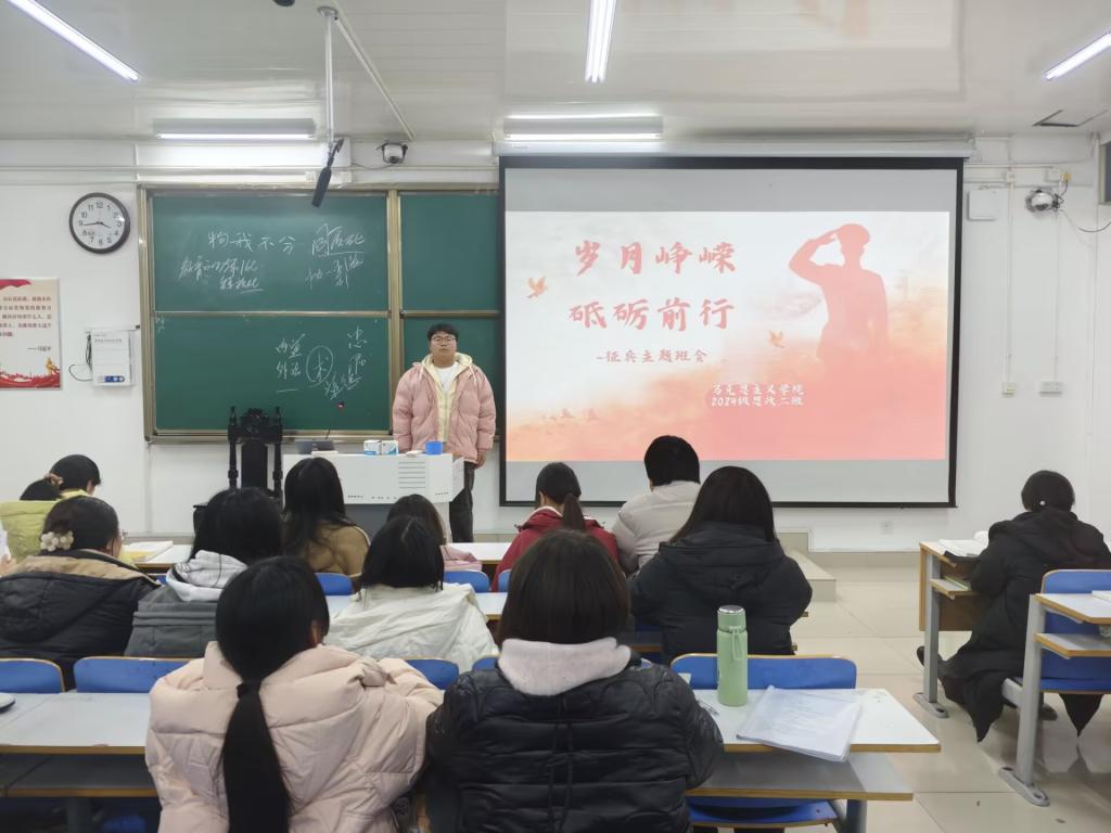 为弘扬爱国主义精神,激发青年学生的参军报国热情,12月10日下午,beat365在线唯一官网2024级思想政治教育二班在社科楼515教室举办了“岁月峥嵘,砥砺前行”主题征兵班会。此次班会由班长王志颖主持,二班全体同学积极参与。