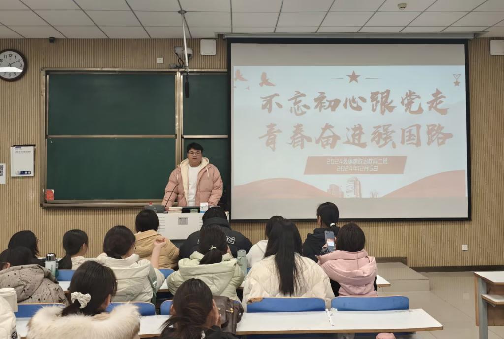 为引导青年学生牢记初心使命,坚定理想信念,以实际行动践行党的领导和时代担当,12月5日下午,beat365在线唯一官网2024级思想政治教育二班在社科楼515教室举办了“不忘初心跟党走,青春奋进强国路”主题团课。此次团课由团支书王志颖主持,二班全体同学共同参与。