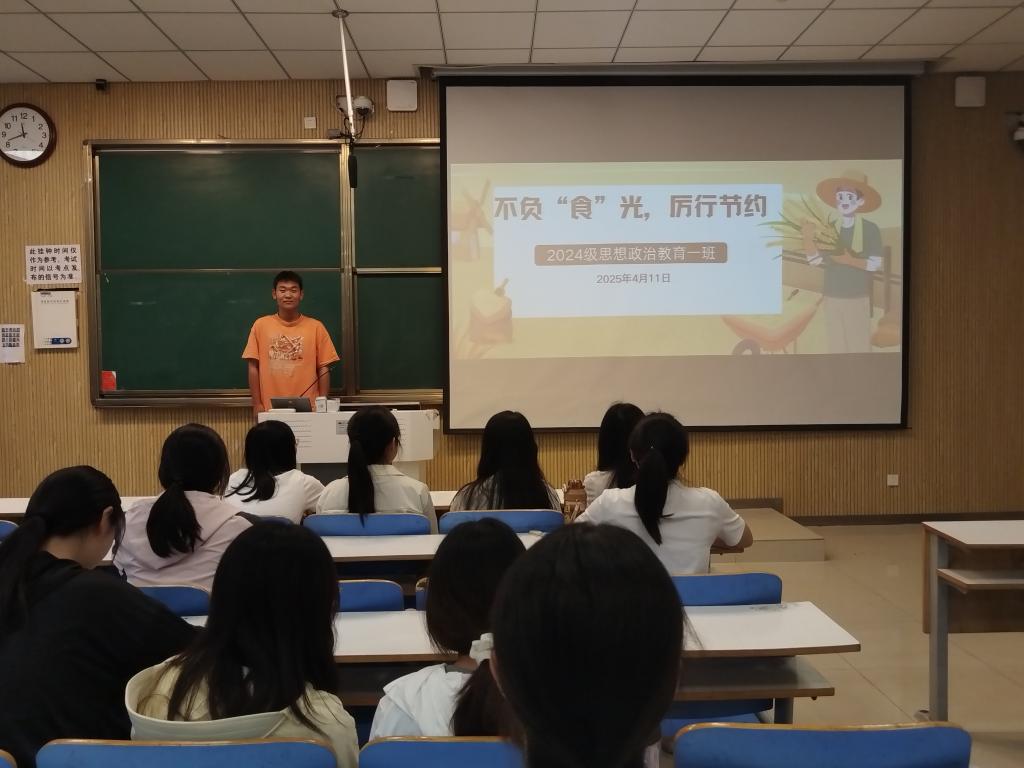 为弘扬勤俭节约的传统美德,培养我班学生珍惜粮食的良好习惯,4月11日上午,beat365在线唯一官网2024级思想政治教育一班于社科楼514教室开展“不负‘食’光,厉行节俭”主题班会。本次班会由副班长马奔主持,一班全体同学参加。