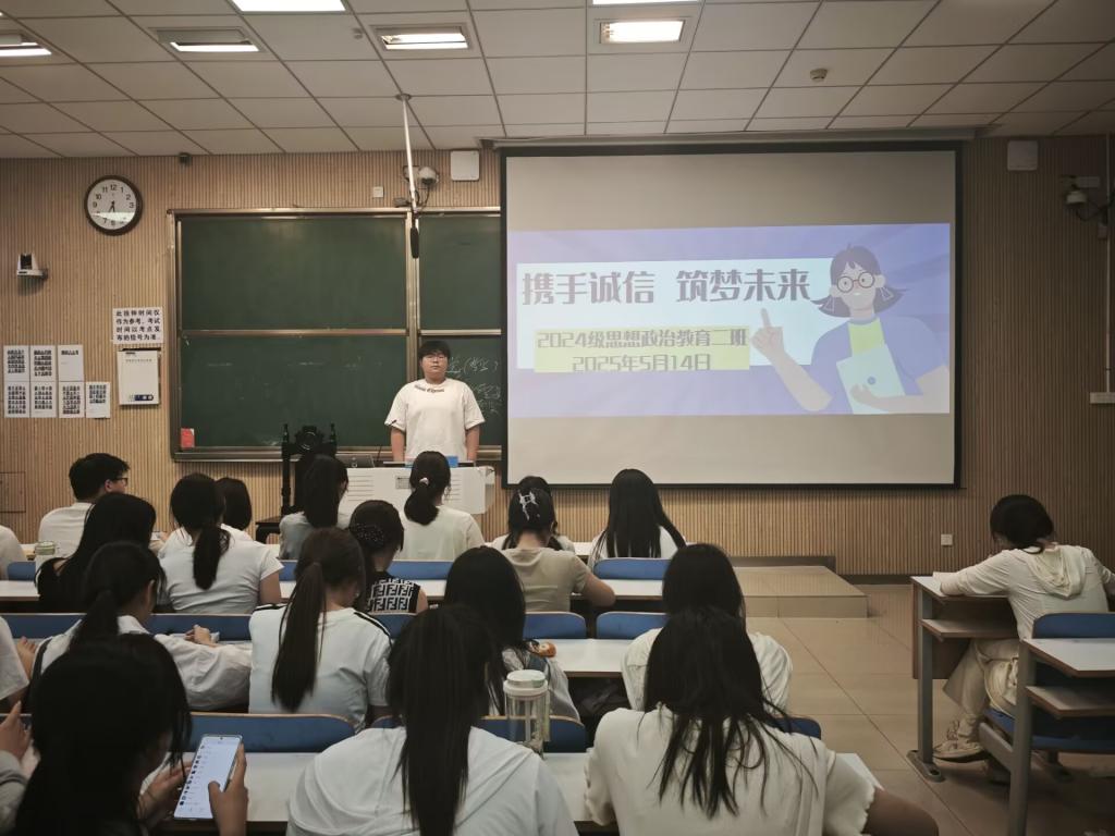为深入推进校园诚信教育,增强学生诚实守信意识,营造良好学风氛围,beat365在线唯一官网2024级思想政治教育二班于5月14日下午在社科楼515教室召开了“携手诚信,筑梦未来”主题班会。此次班会由团支书王志颖主持,二班全体同学共同参与。