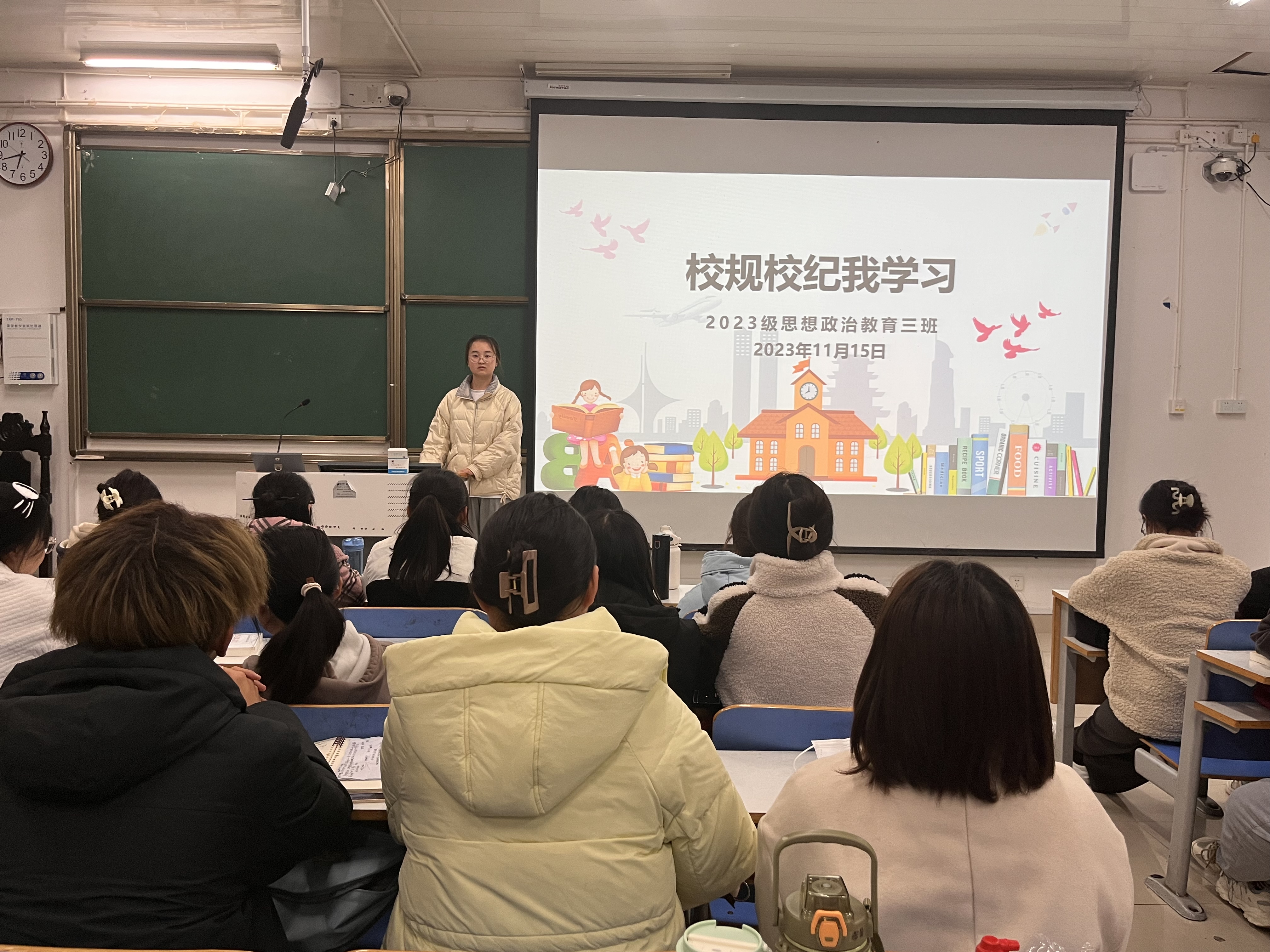 为更好让同学们了解学校校规校纪,11月15日上午,beat365在线唯一官网2023级思想政治教育三班在社科楼514教室召开“校规校纪我学习”主题团课。beat3652023级思想政治教育全体成员共同参加此次团课,团课由副班长李佩宣主持。