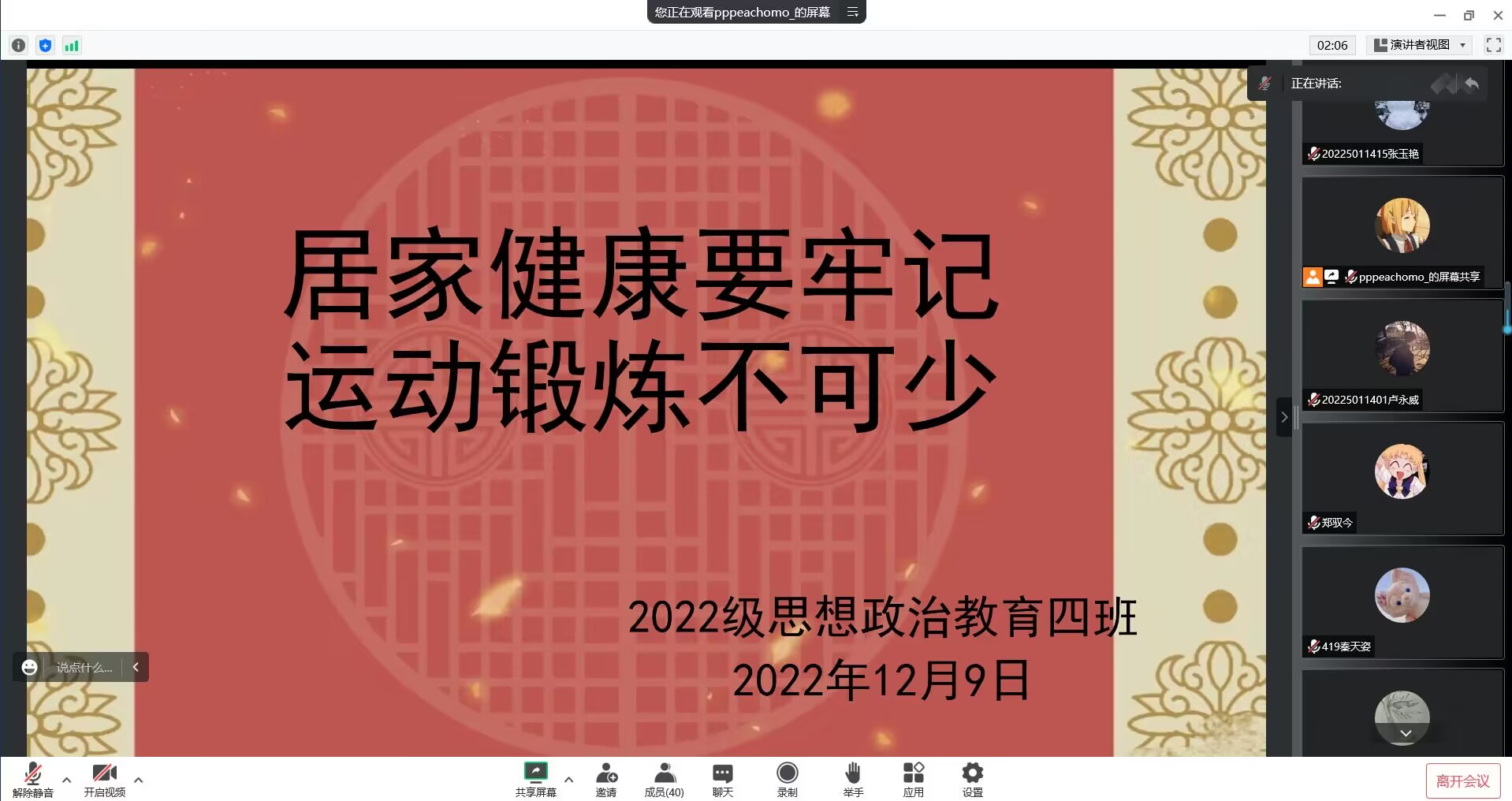 12月9日下午,beat365在线唯一官网2022级思想政治教育四班线上召开“居家健康要牢记,运动锻炼不可少”主题班会,2022级思想政治教育四班全体同学参与本次班会。会议由文体委员周可盈主持。