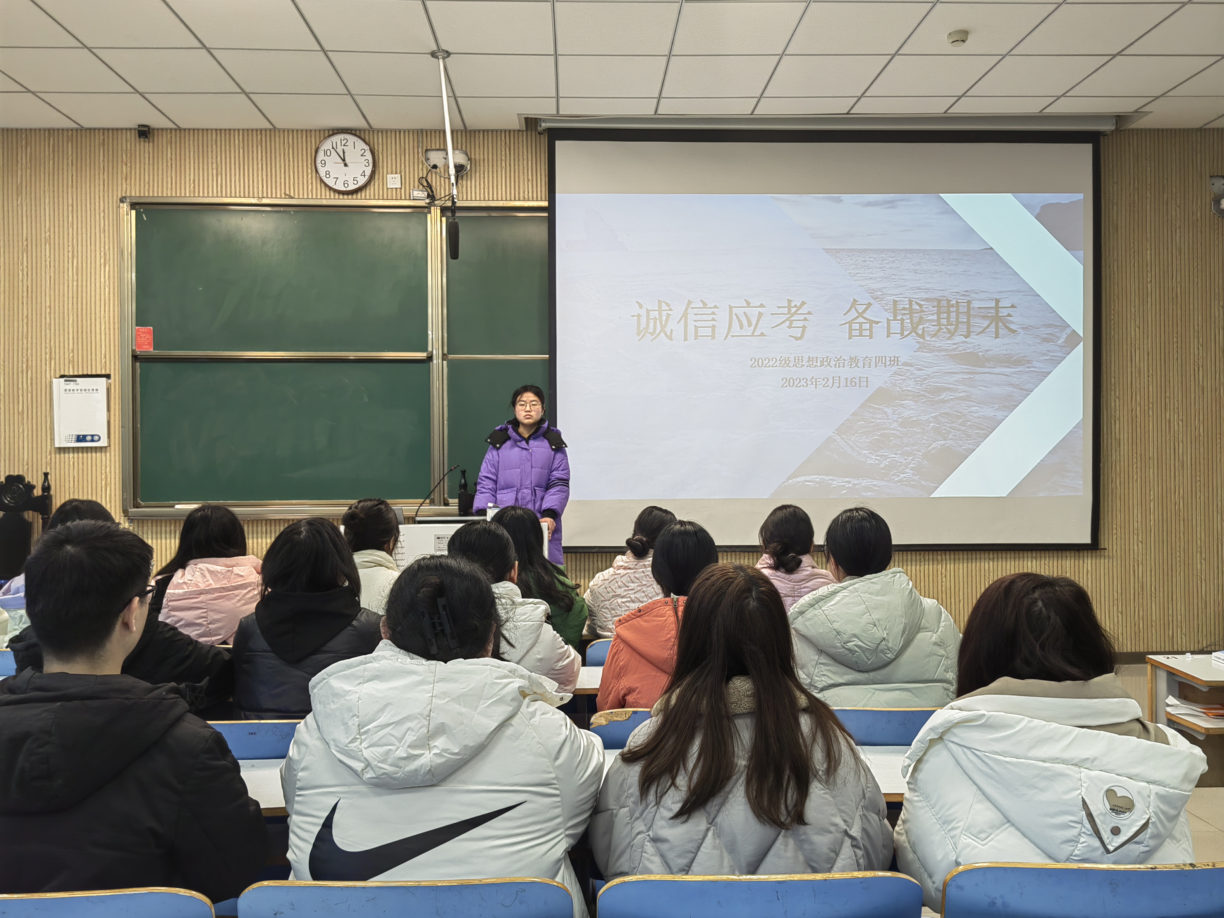 为加强学院学风建设和诚信教育,营造公平、公正的考试氛围,2月16日下午,beat365在线唯一官网2022级思想政治教育四班在社科楼515教室召开“诚信应考,备战期末”主题班会,2022级思想政治教育四班全体同学参加本次班会。会议由学习委员熊祎主持。