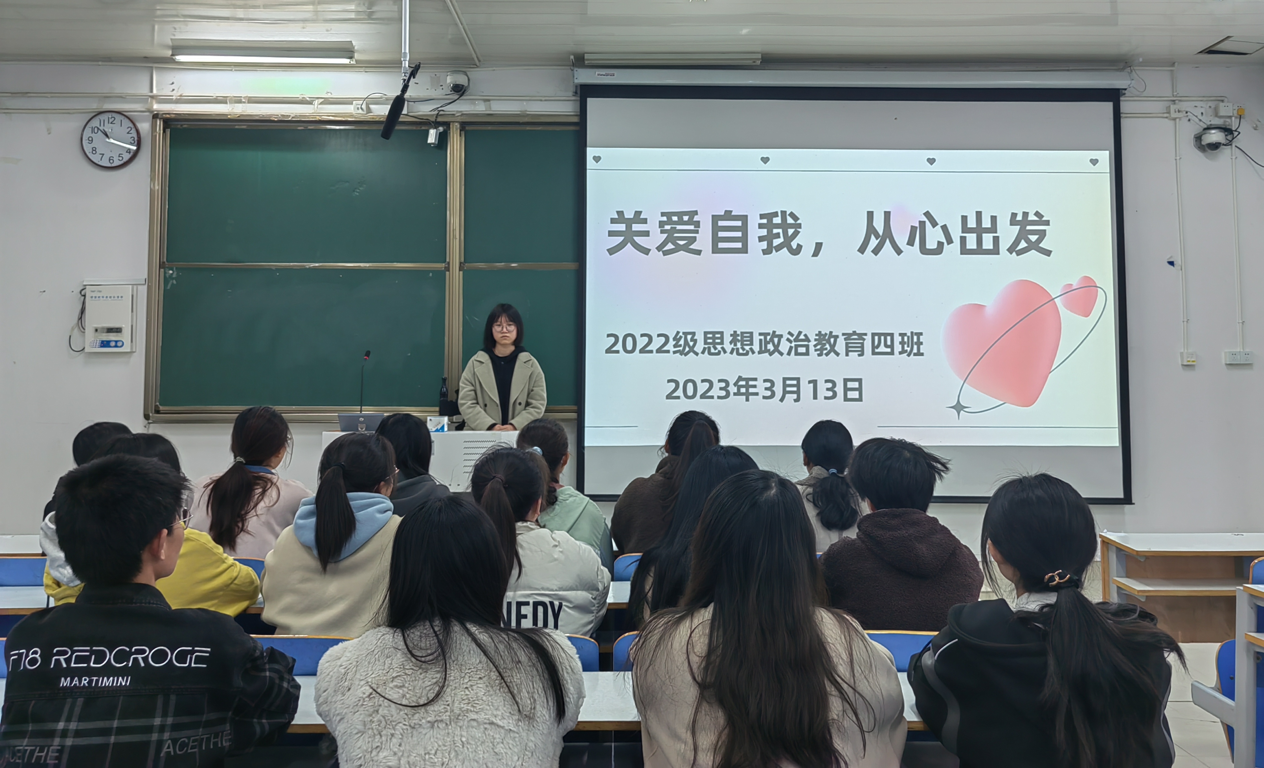 为加强学生心理健康教育,促进其身心和谐发展,3月13日下午,beat365在线唯一官网2022级思想政治教育四班在社科楼514教室召开“关爱自我,从心出发”主题班会,2022级思想政治教育四班全体同学参加本次班会。班会由心理委员徐成若主持。