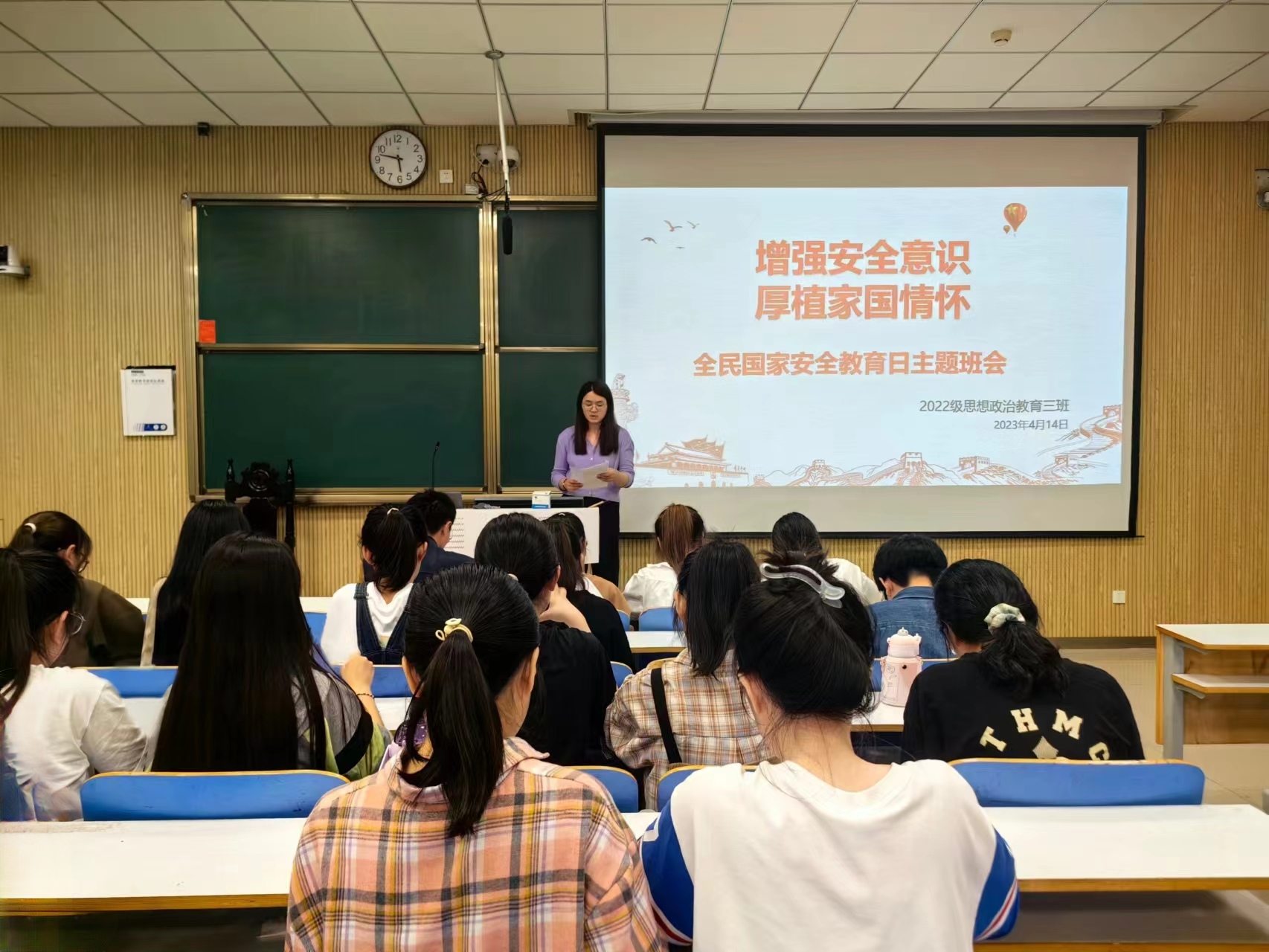 本次班会围绕什么是全民国家安全教育日、为什么重视国家安全和如何维护国家安全三方面展开。班会伊始,余浩洋指出,全民国家安全教育日是为了增强全民国家安全意识,维护国家安全而设立的节日,身为新时代青年要树牢总体国家安全观。接着,余浩洋通过放映PPT、播放视频带领大家认识危害国家安全的行为,告诫同学们国家安全与每个人息息相关,我们有义务学习相关法律知识,维护国家安全。最后,吴梦云老师针对如何维护国家安全提出三点要求:一是提高全民安全意识,定期开展爱国主义教育、警示教育等主题班会;二是自觉规范日常行为,军人照片不任意拍、军车车队不随便插、私密信息不非法传;三是遵守法律履行义务,及时报告危害国家安全的行为、提供知悉证据。