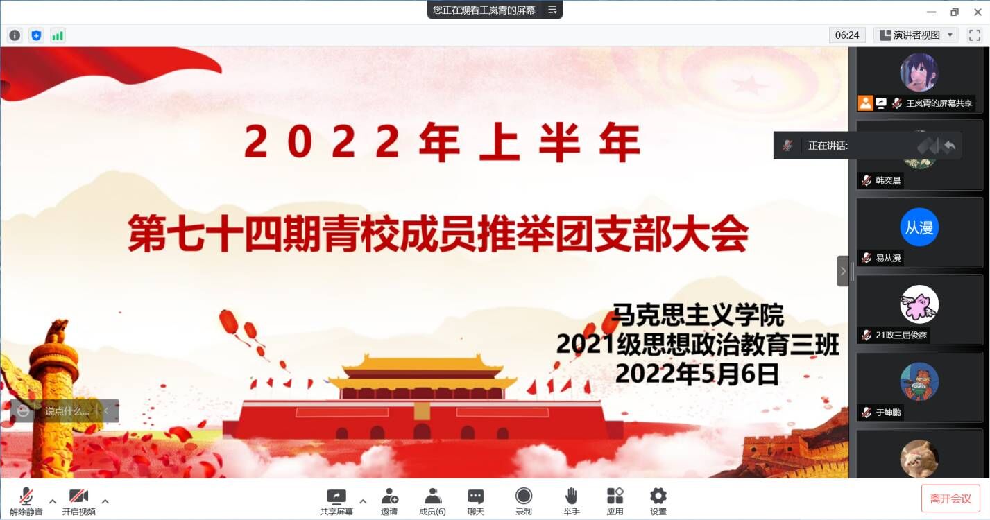 5月6日上午,beat365在线唯一官网2021级思想政治教育三班召开线上第七十四期青校成员推举团支部大会。beat365在线唯一官网2021级思想政治教育三班全体团员参与此次会议。会议由团支书王岚霄主持,秦梦莹担任监票员,陈笑宇担任记录员。
