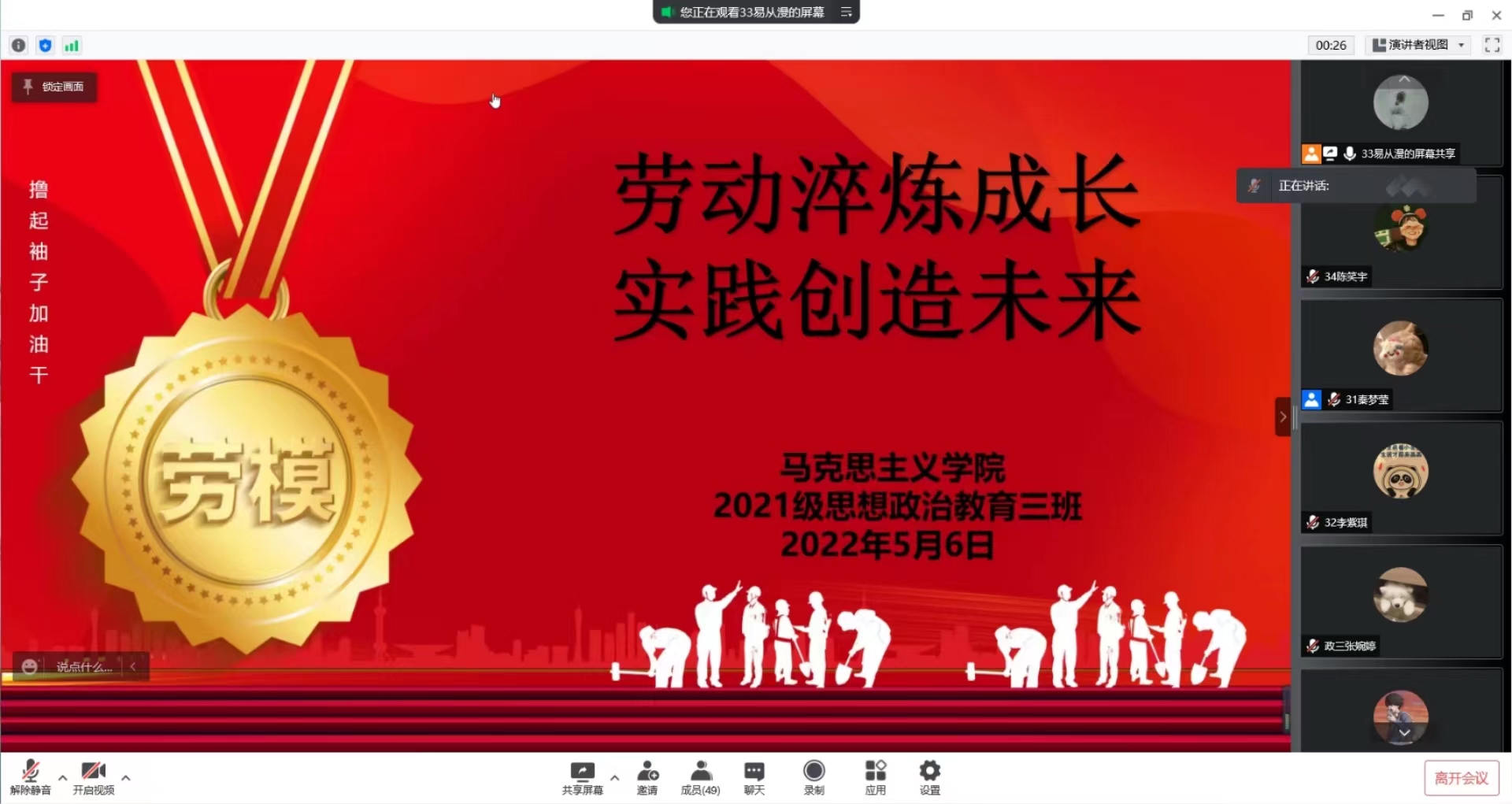 5月6日下午,beat365在线唯一官网2021级思想政治教育三班召开线上“劳动淬炼成长,实践创造未来”主题班会。2021级思想政治教育三班全体成员参与本次会议。会议由副班长兼劳动委员易从漫主持。