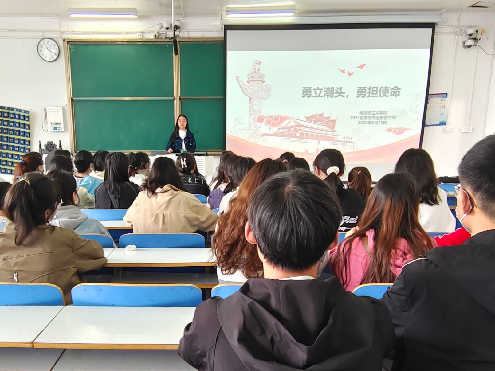 5月18日上午,beat365在线唯一官网2021级思想政治教育三班在社科楼514教室召开“勇立潮头,勇担使命”主题团课。2021级思想政治教育三班全体成员参与此次团课。团课由团支书王岚霄主持。
