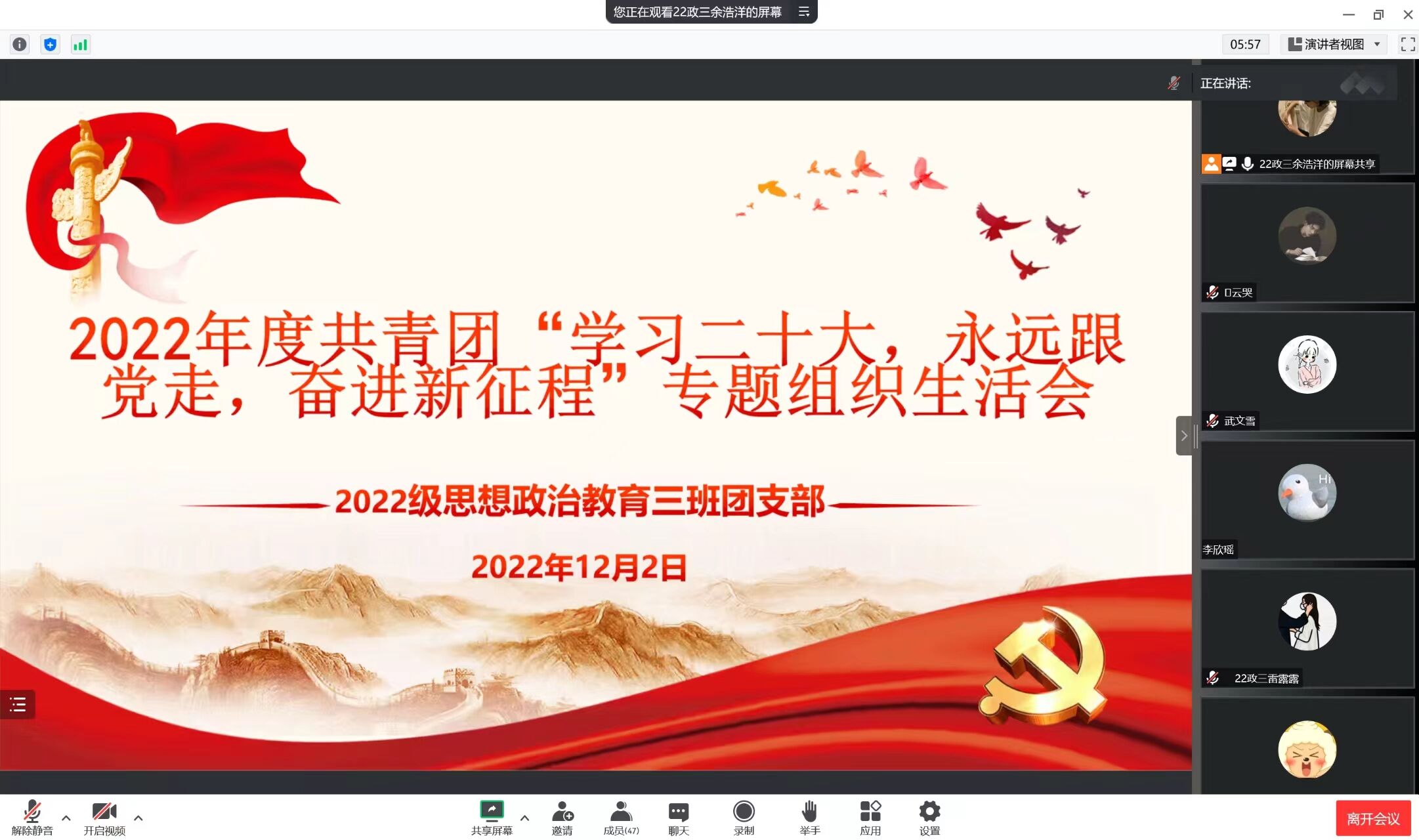 为帮助团员在学习工作中发现问题、解决问题,12月2日下午,beat365在线唯一官网2022级思想政治教育三班在线上开展“学习二十大,永远跟党走,奋进新征程”专题组织生活会。beat3652022级思想政治教育三班班主任吴梦云和三班全体团员共同参加此次专题组织生活会,生活会由团支书余浩洋主持。