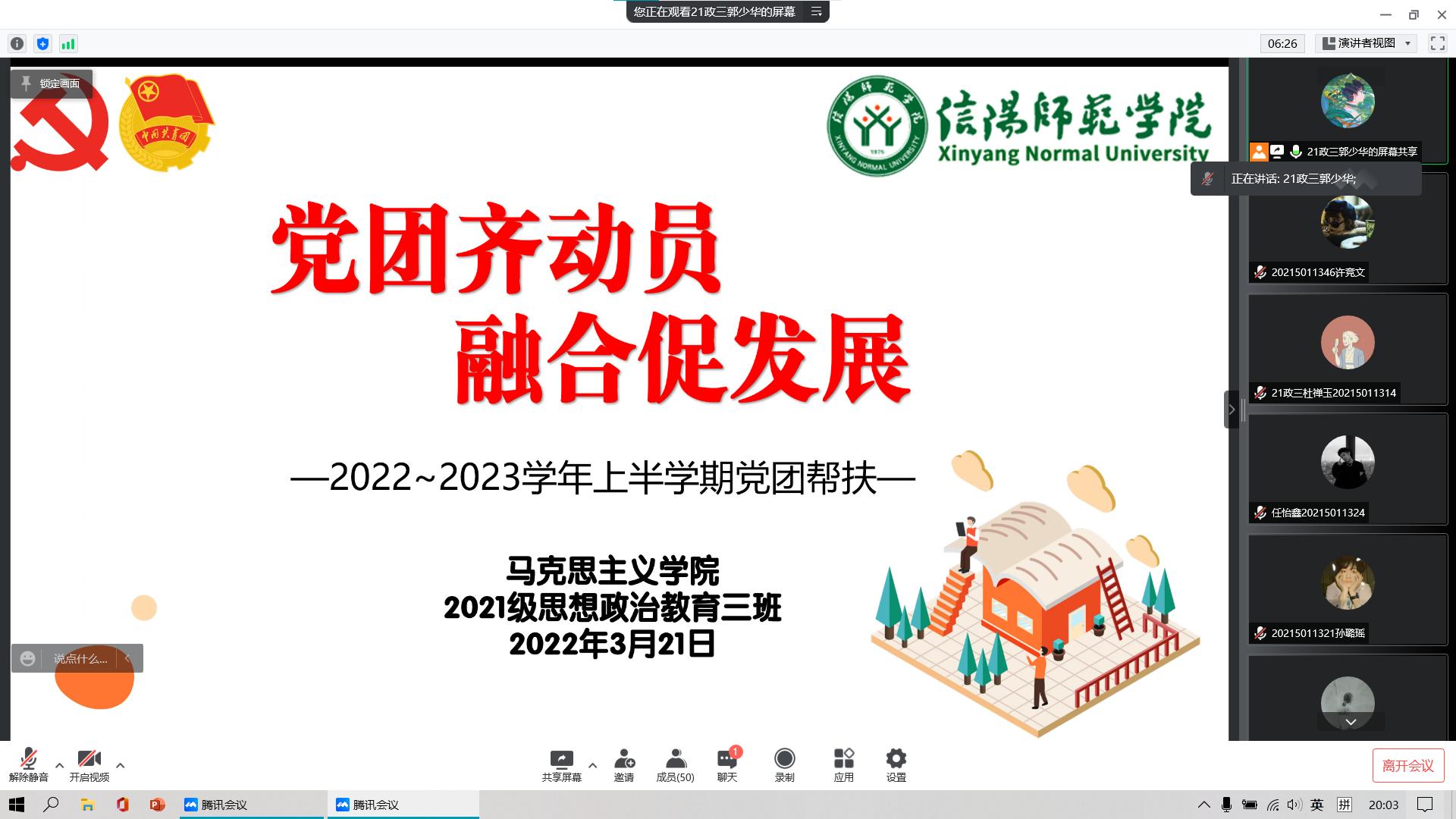 3月21日晚上,beat365在线唯一官网2021级思想政治教育三班开展线上“党员齐动员,融合促发展”党团帮扶活动。辅导员高小佳、2019级思想政治教育一班正式党员李梦琦、2019级思想政治教育二班正式党员杨煦华以及2021级思想政治教育三班全体团员参加了此次活动。活动由团支书郭少华主持。