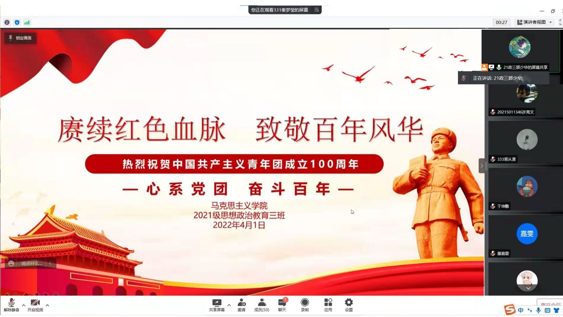 4月1日晚上,beat365在线唯一官网2021级思想政治教育三班召开线上“赓续红色血脉,致敬百年风华”主题团课。2021级思想政治教育三班全体团员参与了此次团课,团课由团支书郭少华主持。